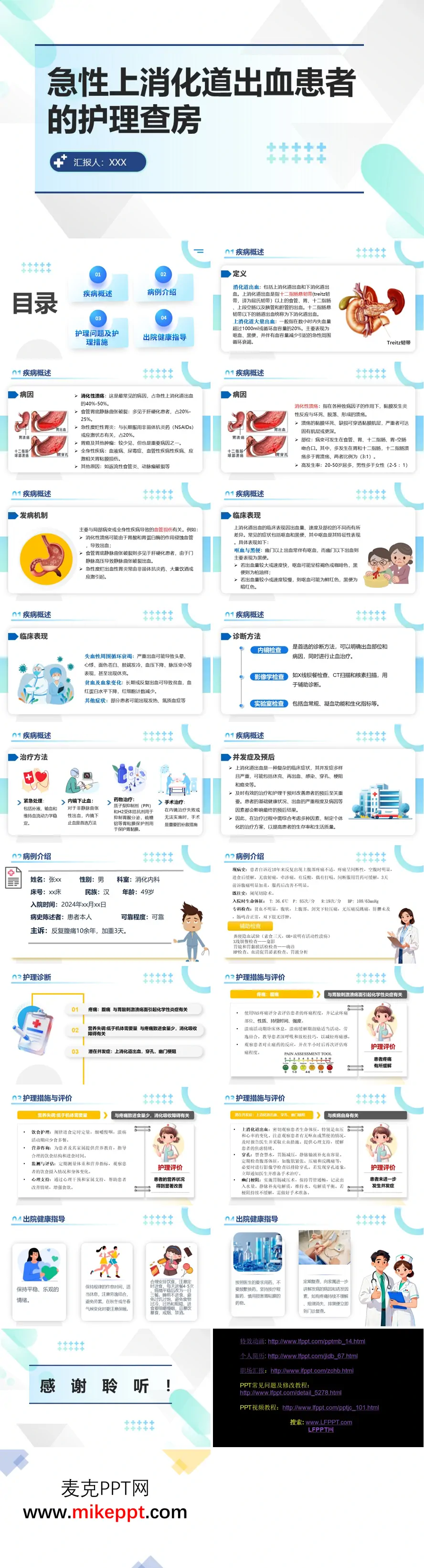 这份关于急性上消化道出血护理查房的PPT内容结构清晰,层次分明,从疾病概述到具体病例护理,系统地呈现了相关知识。 首先,PPT在疾病概述部分通过图文结合的方式,清晰地定义了上消化道出血的范围,特别配图说明了Treitz韧带这一关键解剖标志,帮助理解上下消化道的分界。内容涵盖了病因、发病机制、临床表现、诊断方法和治疗原则,其中特别强调了消化性溃疡是最常见的病因。 随后,PPT引入了一个具体病例。患者为49岁男性,因“反复腹痛10余年,加重3天”入院,有典型的消化性溃疡症状。病例介绍部分详细记录了患者的现病史、既往史、生命体征和辅助检查结果,为后续的护理工作提供了依据。 核心部分聚焦于护理诊断与措施。PPT明确了三个主要的护理诊断:疼痛、营养失调和潜在并发症(出血、穿孔、梗阻)。针对每个诊断,都列出了相应的护理措施和效果评价。例如,在疼痛管理中,使用了VAS疼痛评分表进行评估,并采取了休息、放松技巧和药物干预等综合措施。 最后,PPT的出院健康指导部分通过一系列形象化的图片,为患者提供了详细的生活指导。这些指导包括保持情绪稳定、规律作息、注意保暖、合理安排饮食、遵医嘱用药以及定期复查的重要性。整体而言,这份PPT将理论知识与临床实践紧密结合,构成了一个完整的护理查房教学案例。