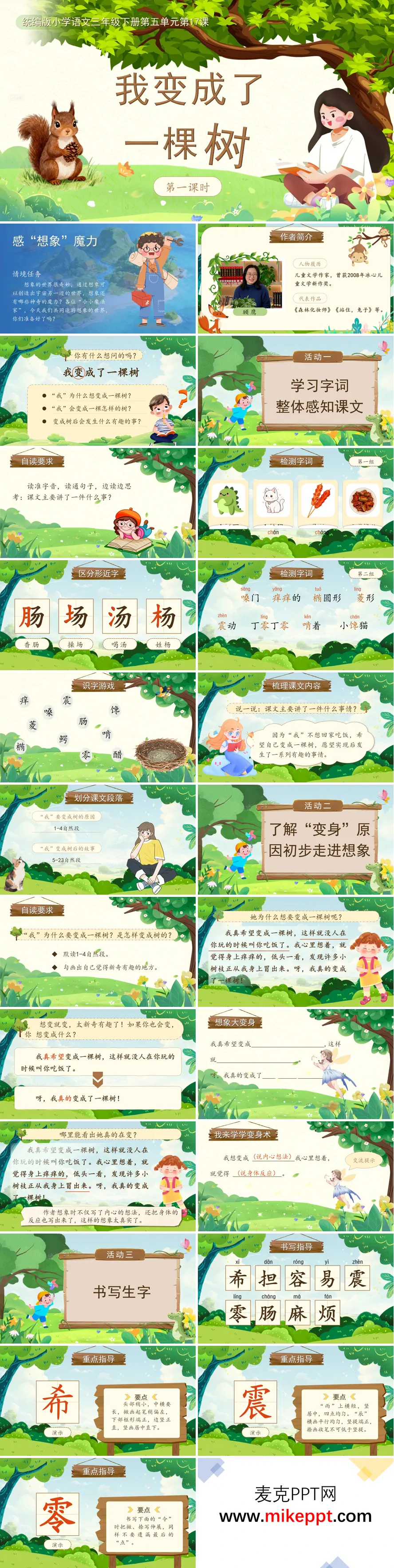 这是一套专为小学语文三年级下册《我变成了一棵树》第一课时精心设计的教学课件,以"感受想象魔力"为核心主题,整体设计层层递进、环环相扣,既注重字词基础的夯实,又关注想象思维的启蒙,体现了中年级阅读教学"基础为先、兴趣为重、思维为核"的理念。 课件开篇巧妙创设情境任务,通过展示作者顾鹰的照片与简介,介绍这位擅长创作童话与儿童小说的作家及其代表作品,营造神秘的想象氛围,迅速激发学生的阅读兴趣与想象期待,自然引入新课学习。 "学习字词,整体感知课文"环节注重自主学习与趣味识字相结合。课件引导学生通过自由朗读、标注段落、圈画生词等方式初步接触文本;随后设计"识字闯关"游戏,以"肠、场、汤、杨"等形近字辨析为重点,通过"加一加""换一换""编口诀"等方法帮助学生区分字形、理解字义,如"月字旁,挂香肠""土字旁,广场宽"等;同时梳理课文整体脉络,引导学生把握故事核心情节——"我"因为不想被妈妈催着吃饭,竟然变成了一棵树,为后续深入研读奠定内容基础。 "了解变身原因,初步走进想象"是本节课的核心探究活动。课件聚焦课文第1至4自然段,引导学生细读探究"我"变身的内在动机:一方面是希望"在树上玩,不回家吃饭"的贪玩心理,另一方面是"这样就没人在你玩的时候叫你吃饭了"的逃避心理。通过分析作者如何将内心想法("我真希望变成一棵树")与身体反应("我心里想着,就觉得身上痒痒的,低头一看,发现许多小树枝正从我身上冒出来")巧妙结合的想象手法,让学生初步感知想象的神奇——将抽象的愿望转化为具体的形象变化。紧接着设计"想象大变身"仿写练习,鼓励学生借鉴这种"愿望+变化"的想象模式,尝试创作自己的变身故事开头,实现从阅读理解到表达运用的初步迁移。 "书写生字"环节体现细致指导。课件重点讲解"希、震、零、肠"等字的结构特点与书写要点:"希"上小下大,"巾"部要宽;"震"雨字头略扁,"辰"部舒展;"零"雨字头覆盖下方,"令"部撇捺开张;"肠"左窄右宽,"月"部瘦长。通过范写、描红、临写、评价等步骤,培养学生规范书写的良好习惯。 课堂小结部分精炼回顾本节课的核心收获——认识了有趣的生字词,了解了"我"变成树的原因,初步感受了将愿望变成现实的想象魔力,并巧妙设置悬念:变成树之后会发生哪些奇妙的事情?妈妈会发现这个秘密吗?为第二课时深入探究"长满鸟窝"的有趣情节与"妈妈如何认出我"的情感高潮做好铺垫。整节课以任务驱动贯穿始终,在夯实语文基础的同时有效激活了学生的想象思维,为中年级想象类文本教学提供了扎实有效的范例。
