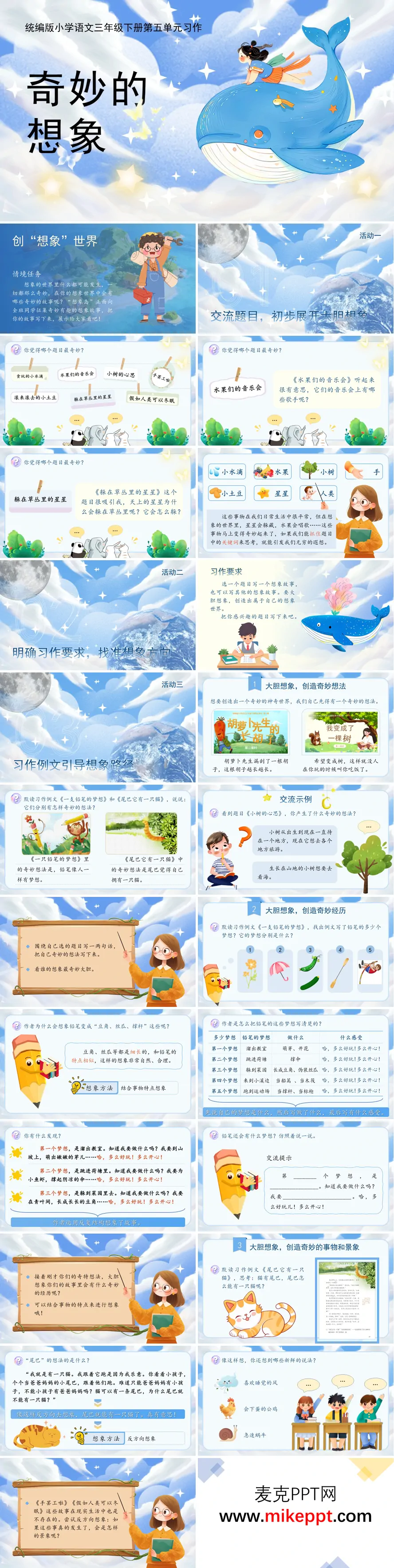 这是一套专为小学语文三年级下册第五单元习作《奇妙的想象》精心设计的教学课件,以"创想象世界"为核心主题,通过四大递进式教学环节,系统引导学生从感知想象、学习技法到实践创作、交流提升,完成一次完整的想象习作之旅,充分激发学生的创新思维与表达潜能。 课件开篇巧妙创设教学情境,以一组充满童趣的习作题目吸引学生目光——"贪吃的小水滴"会经历怎样的冒险?"躲在草丛里的星星"有着什么秘密?"滚来滚去的小土豆"将踏上何种旅程?"假如人类可以冬眠"世界会发生什么变化?这些新颖有趣的题目瞬间打开学生的思路,引导他们初步展开大胆想象,感知想象题材的无限趣味与广阔空间。在此基础上,课件明确本次习作的核心要求:从提供的题目中选择自己最感兴趣的一个,也可以自拟题目,写一个想象故事,鼓励学生自主选择、自由表达。 核心教学环节采用"例文引路、方法拆解"的策略,通过三篇典型范文为学生搭建写作支架。结合《一支铅笔的梦想》这一经典文本,详细讲解依托事物特点展开想象的构思方法——铅笔细长可以当船篙、可以当木筏、可以当撑杆,铅笔尖尖可以当标枪,引导学生发现想象要建立在事物固有特征之上;同时分析文中运用反复结构("知道我要做什么吗?""哈,多么好玩!多么开心!")组织多个奇妙经历的写作技巧,让故事既丰富又有节奏感。结合《尾巴它有一只猫》这一逆向思维范本,传授反方向想象的大胆技法——打破"猫有尾巴"的常规认知,想象"尾巴有一只猫"的奇妙关系,启发学生从相反角度、逆向立场思考问题,创造出出人意料又在情理之中的想象世界。 最后的练习写作与交流评价环节注重实践运用与互动提升。课件提供清晰的评价标准,如"想象是否大胆新奇""故事是否完整有趣""情节是否清楚连贯"等,引导学生进行自评与互评;鼓励学生大胆运用所学方法,将头脑中的奇妙构思转化为完整的文字故事;通过小组交流、全班分享、互相提建议等方式,在思维碰撞中完善作品,在修改打磨中提升想象能力与表达水平。整套课件让学生在趣味盎然的创作活动中逐步解锁想象密码,学会用独特的视角观察世界,用奇妙的故事表达自我,最终写出属于自己的奇妙想象世界,充分体现了习作教学"激趣—授法—实践—提升"的完整链条。