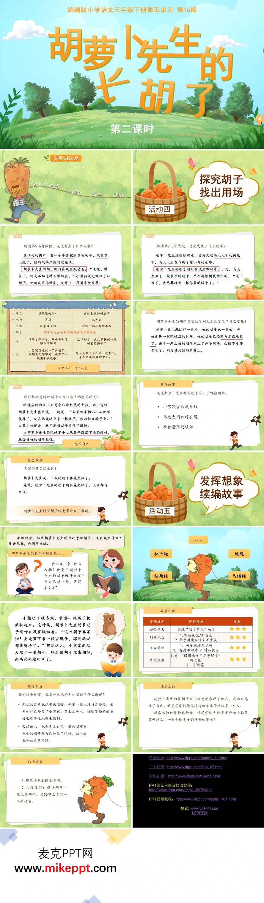 这是一套专为统编版小学语文三年级下册《胡萝卜先生的长胡子》第二课时精心设计的教学课件,整体风格清新童趣,以生机盎然的绿色草地和憨态可掬的胡萝卜先生卡通形象作为视觉主线贯穿始终,营造出轻松愉悦的学习氛围,充分契合三年级学生的审美特点与认知水平。 课件以"生字词认读"环节扎实开篇,通过词语卡片认读、语境填空、快速抢答等多样化形式,带领学生巩固"萝卜""发愁""浓密""近视""继续"等本课核心词汇,在温故知新中夯实语言基础,为后续深入研读做好铺垫。 主体教学内容围绕两大核心活动层层展开。第一大活动"探究胡子,找出用场"引导学生回归文本,细致梳理胡萝卜先生长胡子的奇妙经历。通过圈画关键词句、填写情节表格等方式,学生清晰感知到:胡萝卜先生因近视漏刮了一根胡子,这根胡子蘸到果酱后疯狂生长,先是成为小男孩放风筝的线,后又变成鸟太太晾晒尿布的绳。课件引导学生发现这些"用场"的共同点——都是在胡萝卜先生毫无察觉的情况下,他的胡子无意中帮助了他人,为后续理解主题埋下伏笔。 第二大活动"发挥想象,续编故事"是本节课的创意高潮。课件设置小组合作讨论环节,鼓励学生大胆想象:胡萝卜先生的长胡子继续生长,还会遇到谁?还能派上什么新用场?学生思维活跃,纷纷提出胡子可以变成小姑娘的秋千绳、同学们的跳绳、小蚂蚁的桥梁等创意设想。为降低续写难度,课件提供了"小熊用胡子捆柴"的完整范例,从情节发展、对话设计到结尾处理,给予学生具体的写作支架;同时出示"故事评价"量表,从"是否贴合原文风格""想象是否大胆合理""情节是否完整有趣""语言是否生动流畅"等维度,引导学生自评互评,在修改完善中提升续写质量。 "感受启发"环节实现从故事到道理的升华。课件引导学生思考:胡萝卜先生并不知道自己帮助了别人,为什么还感到快乐?通过讨论交流,师生共同提炼出故事的双重主旨——无心的善意也能给他人带来温暖,帮助他人往往也会惠及自己(胡萝卜先生的胡子因此变得更牢固)。这一设计让学生在感受想象趣味的同时,体悟人性之美。 "课堂总结"部分系统回顾本课所学,梳理"预测—验证—想象—续编"的阅读策略。课后作业设计分层兼顾:基础作业要求规范书写本课生字词,巩固书写能力;拓展作业鼓励学生完成50字左右的片段续写,将课堂想象延伸至课外创作。整套课件让学生在趣味盎然的探究与创作中,深化对文本的理解,提升想象力与表达能力,充分体现了预测策略单元"读想结合、学用一致"的教学理念。