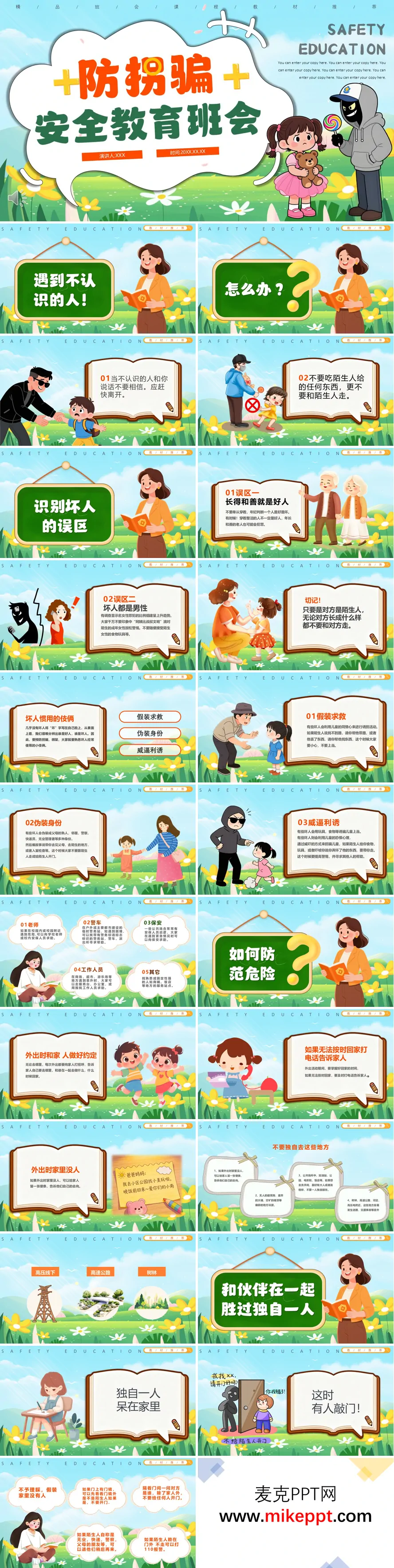 这套安全教育主题PPT内容围绕儿童自我保护知识展开,通过图文结合的形式系统性地讲解了应对陌生人、识别危险情境和提升安全意识的实用方法。 PPT首先指出儿童对陌生人常见的认知误区,例如“坏人都是男性”的错误观念,强调女性罪犯也可能存在,提醒孩子不应因性别放松警惕。随后列举了坏人常用的诱骗手段,包括假装求救、伪装身份和威逼利诱,并通过具体场景(如被问路、被食物玩具引诱)说明如何应对。 在防范措施方面,PPT建议孩子外出前主动告知家人行程、约定回家时间,避免独自前往偏僻或危险场所(如高压电附近、废弃大楼)。独自居家时,需锁好门窗,通过开电视、亮灯制造家中有人的假象,并坚决不为陌生人开门,遇到纠缠可报警求助。 最后,PPT总结了可求助的对象(老师、警察、保安等),并以朗朗上口的安全口诀强化记忆,整体内容注重实用性与儿童的心理接受度,旨在通过情景化指导提升孩子的危险规避能力。
