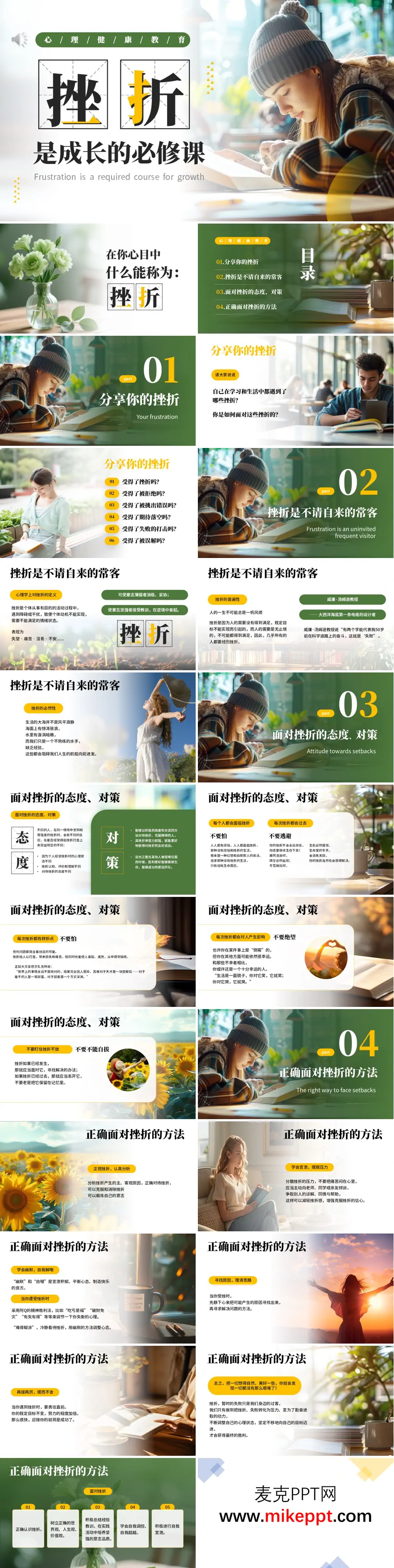这套PPT以“心理健康教育:挫折是成长的必修课”为主题,系统性地阐述了挫折在个人成长过程中的意义及应对方法。内容分为四个部分:首先通过互动提问引导观众分享自身挫折经历,强调挫折的普遍性;其次从心理学角度定义挫折,指出其既是情绪挑战也是成长契机,并引用事例说明挫折的必然性;接着分析不同个体面对挫折的态度差异,强调积极心态对适应挫折的关键作用;最后提供具体应对策略,如理性分析挫折成因、情绪宣泄、幽默化解、持续行动等,倡导将挫折转化为前进动力。整体结构清晰,融合理论说明与实用建议,旨在帮助观众建立正确的挫折观,提升心理韧性。