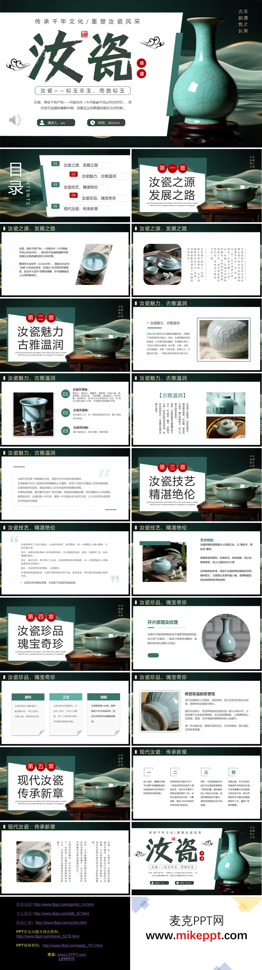 《汝瓷艺术鉴赏》PPT内容以五大章节系统展现了这一非物质文化遗产的独特魅力。文档开篇以"似玉非玉而胜似玉"的诗意表述奠定基调,通过历史脉络、工艺特色、传世珍品等维度展开深度解读。 在"汝瓷之源,发展之路"章节,重点追溯了隋大业年间(605年)得名于汝州的历史渊源,展现了北宋时期"百里窑火连天"的盛况。配图生动呈现了高岭土、玛瑙等原料特质,印证了"汝窑为魁"的工艺地位。 "汝瓷魅力,古雅温润"单元通过釉色美学解析凸显艺术价值。天青釉"雨过天晴云破处"的意境、天蓝釉的青蓝辉映、月白釉的温润如玉,配合蝉翼纹、梨皮开片等自然纹理,完美诠释"青如天,面如玉"的审美特征。该部分深入阐释了釉色背后蕴含的天人合一哲学思想。 工艺技术章节详述了从选料、拉坯到烧制的72道工序,特别强调1300℃窑温控制的难度。最后两个章节通过全球65件传世珍品的稀缺性数据,以及现代匠人结合科技创新的实践,完整构建了汝瓷从历史传承到当代发展的知识体系。整个PPT图文并茂地展现了汝瓷作为文化载体的艺术价值与工艺成就。
