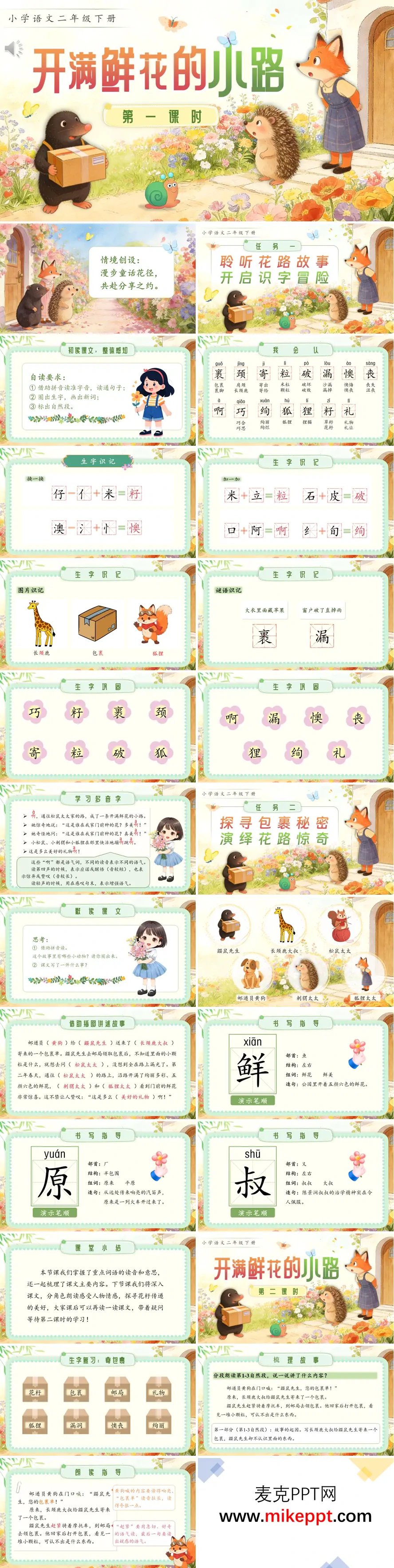这是一套专为小学语文二年级下册《开满鲜花的小路》精心设计的教学课件,完整覆盖两个课时的教学内容,整体风格清新雅致、童趣盎然,以缤纷的花草图案和可爱的小动物插画为视觉元素,营造出温馨梦幻的童话氛围。 第一课时以"漫步童话花径,共赴分享之约"为情境主题,首先引导学生借助拼音自主朗读课文,初步感知故事内容并梳理情节脉络;随后通过"换一换""加一加"等趣味识字法,结合生动的图片和猜谜游戏,重点指导学生掌握"裹、漏、懊"等生字的正确读音与规范书写,同时对多音字"啊"的不同用法进行辨析区分;最后借助课文插图帮助学生复述故事,并着重指导"鲜、原、叔"等汉字的书写要领。 第二课时围绕"探寻包裹秘密,演绎花路惊奇"展开深入学习,先通过多种方式复习巩固生字词,再通过分角色朗读、情境填空等互动形式,引导学生深入体会松鼠太太等角色发现鲜花小路时的惊喜与赞叹之情,进而理解"美好的礼物"所蕴含的深刻内涵,感悟分享带来的快乐与美好;课堂尾声拓展积累ABCC式词语,并布置续写花路故事和阅读相关童话的创意作业,让学生在实践中延续课堂收获,将阅读与表达能力的培养延伸至课外。
