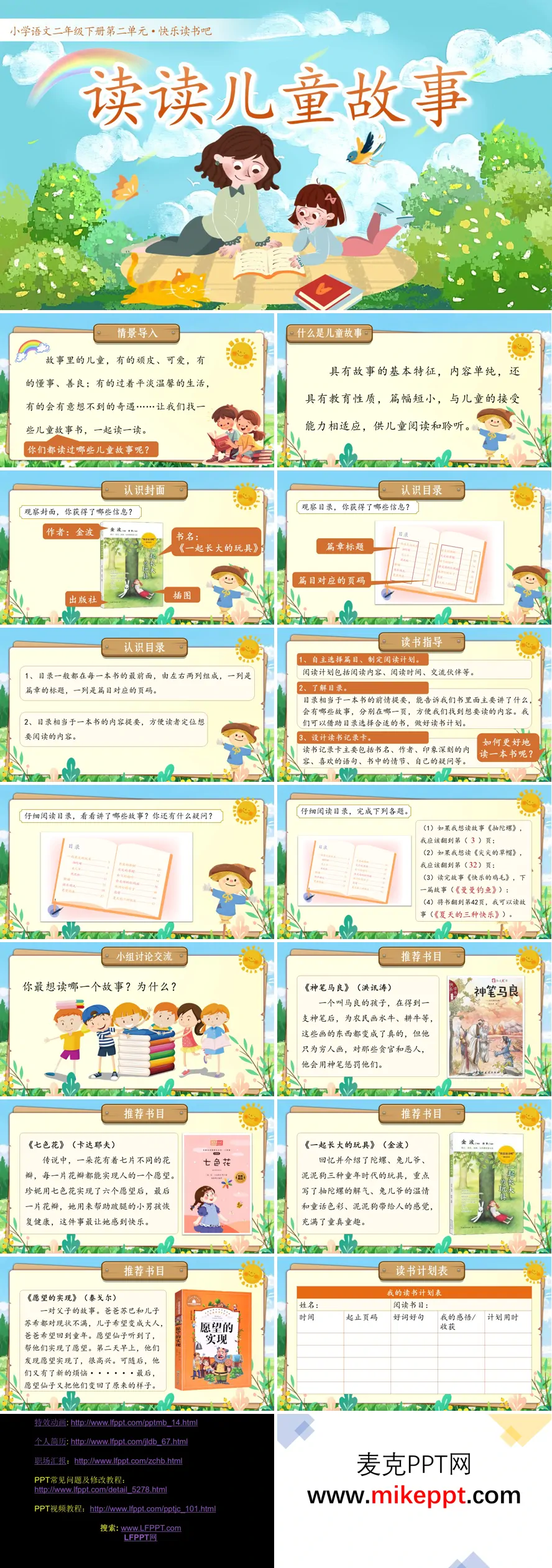 这是一套专为小学语文二年级下册"快乐读书吧"板块精心研发的配套教学课件,主题定位为"读读儿童故事",整体采用清新明快、童趣盎然的插画风格进行视觉呈现,旨在以富有亲和力的设计语言,带领低年级学生轻松愉快地走进儿童故事的奇妙世界,开启一段充满想象与温情的阅读旅程。 课件开篇精心设计情景导入环节,以"故事里的儿童有的顽皮可爱,有的善良懂事"这一贴近学生生活的描述引发情感共鸣,唤醒学生已有的阅读经验。教师引导学生回忆自己曾经读过的儿童故事,分享故事中印象深刻的人物形象与情节片段,在交流互动中自然点燃阅读兴趣,营造"我想读、我要读"的积极心理氛围,为后续教学奠定良好的情感基础。 随后,课件清晰阐释儿童故事的基本定义与文体特征,帮助学生建立科学的阅读认知。通过简洁明了的语言,向学生介绍儿童故事具有内容单纯易懂、篇幅短小精悍、语言生动活泼等文本特点,同时兼具潜移默化的教育价值,非常适合儿童阅读与聆听。这一环节既是对阅读对象的理性认知,也为学生日后独立选择读物提供了判断依据。 在核心教学板块,课件系统呈现实用高效的阅读方法指导。首先指导学生学会观察书籍封面,从中获取作者姓名、书名、出版社、插图风格等关键信息,培养初步的信息提取能力;继而重点讲解目录的功能与使用方法,演示如何通过目录快速定位故事所在页码,如何根据目录制定个性化的阅读计划,将整本书的阅读任务分解为可操作的阶段性目标。此外,课件还详细设计了读书记录卡的制作方法,引导学生记录阅读日期、故事名称、主要人物、精彩语句、阅读感受等内容,让阅读过程留下可见的成长痕迹。 为巩固方法学习效果,课件设置互动练习环节。学生通过观察模拟目录,完成"根据故事名称找页码""根据页码猜故事""选择最想读的故事并说明理由"等分层练习,在动手实践中加深对书籍结构的理解,熟练掌握目录这一重要的阅读工具。 在书目推荐板块,课件精心遴选《神笔马良》《七色花》《一起长大的玩具》《愿望的实现》等中外经典儿童文学作品,配以简短而生动的文字介绍,或突出主人公的神奇经历,或点明故事中的美好情感,或揭示作品的教育意义,帮助学生在有限时间内了解书籍内容,根据个人兴趣自主选择阅读书目,搭建起从课堂指导到课外阅读的有效桥梁。 课件最后呈现配套的读书计划表模板,引导学生规划每周阅读篇目,记录阅读时长,摘抄优美词句,绘制阅读心情,撰写简短书评,在持续性的阅读实践中培养良好的阅读习惯,收获扎实的阅读成果。 整体来看,这套课件构建了从兴趣激发到方法指导,从书目推荐到实践工具的完整阅读引导体系,各环节紧密衔接,层层递进,既关注阅读热情的点燃,又重视阅读能力的培养,更着眼于阅读习惯的养成,非常适合二年级学生开启系统而愉悦的儿童故事阅读之旅,体现了"快乐读书吧"栏目"激发阅读兴趣、习得阅读方法、培养阅读习惯"的编写宗旨。