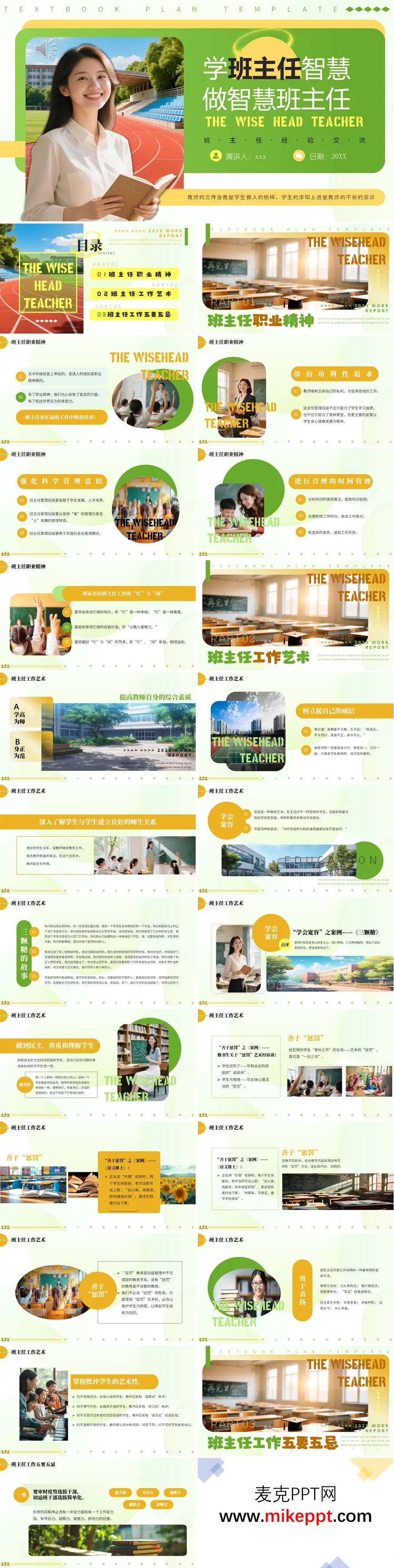 这套PPT以《学班主任智慧 做智慧班主任》为主题,围绕班主任工作经验展开系统阐述,整体结构清晰,内容层层递进。文档封面以深蓝色为主调,搭配醒目标题和日期信息,突出专业交流氛围。 第一部分聚焦班主任职业精神,强调淡泊功利、科学管理和时间规划的重要性。内容提出要辩证看待“忙”与“闲”的关系,通过合理分配任务提升效率,并配有时间管理:第二部分深入探讨班主任工作艺术,通过案例解析具体方法。例如陶行知的“三颗糖”故事展现以宽容引导代替批评:另一案例中,教师巧妙结合语文教学对犯错学生进行对句练习,体现“惩罚”的教育艺术:第三部分总结班主任工作“五要五忌”,从班干部选拔、长效管理到公平处事提出实操建议,强调避免工作简单化或厚此薄彼。结尾页再次呼应主题,强化“智慧班主任”的核心定位。整套内容理论结合实践,穿插经典教育案例,兼具启发性与指导价值。
