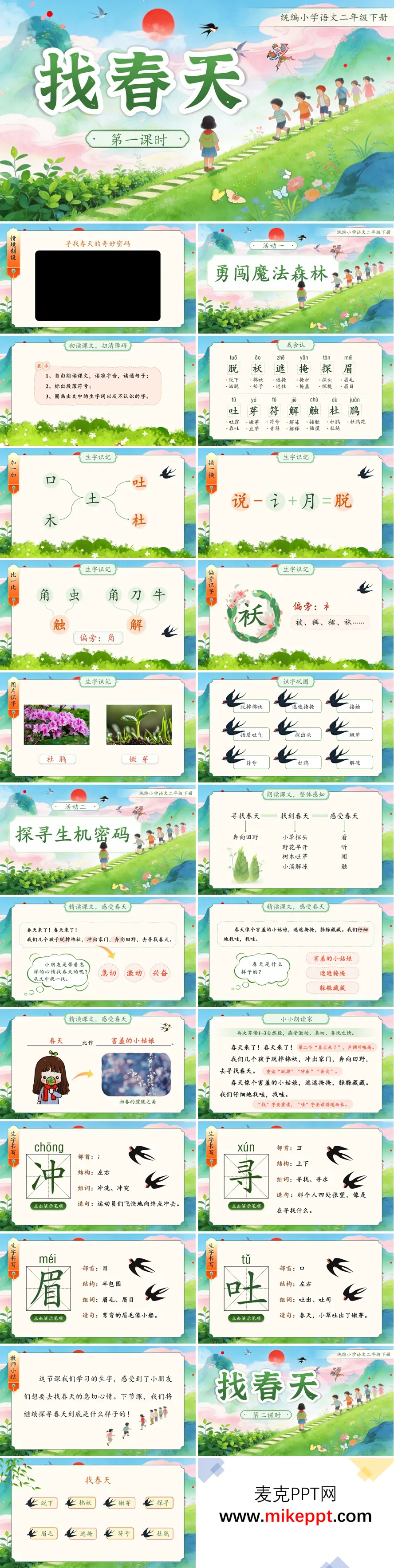 这是一套专为统编版小学语文二年级下册《找春天》精心设计的教学课件,共两课时,整体风格清新灵动,洋溢着盎然春意。 第一课时以"寻找春天的奇妙密码"为情境导入,带领学生初读课文、扫清字词障碍。通过"勇闯魔法森林"等趣味闯关活动,重点指导学生认读和书写"脱、袄、遮"等生字,并巧妙运用字形拆解、图片辅助等多元方法,帮助学生理解"杜鹃、嫩芽"等词语的含义。在"探寻生机密码"环节,引导学生在朗读中感受孩子们奔向田野寻找春天的急切与兴奋,深入体会"春天像个害羞的小姑娘"这一精妙比喻的形象与贴切。 第二课时聚焦精读品悟,采用图文结合的方式,引领学生细致观察小草、野花、树木、小溪等景物的春日特征,品味"探出头""眼睛""音符"等拟人、比喻手法的生动表达,并拓展积累"春暖花开、草长莺飞"等描写春天的优美成语。整套课件将识字教学、朗读指导与审美感知有机融合,让学生在沉浸式的情境体验中,自然而然地走进充满诗意的春天文本世界,感受语言文字的魅力与大自然的美好。