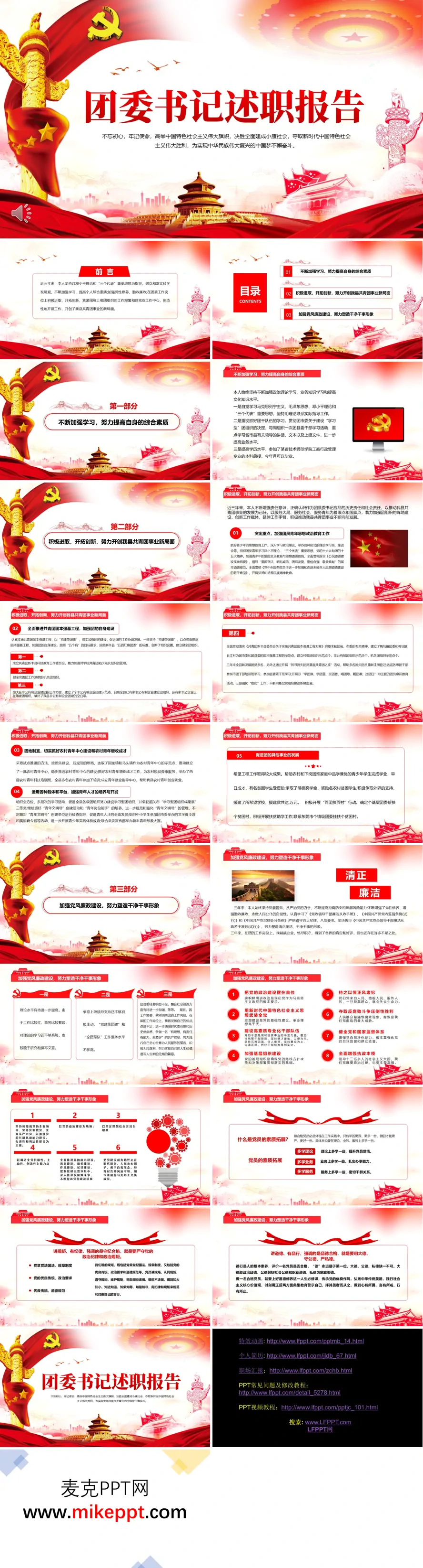这份述职报告PPT以“不忘初心,牢记使命”为主题,结构清晰,内容详实,主要分为三大部分:个人学习提升、共青团工作创新和党风廉政建设。 在个人学习部分,PPT强调了团委书记持续加强政治理论学习、组织团干队伍学习并提升自身学历水平的情况,展现了其综合素质的提升路径。 在工作创新方面,PPT重点突出了团员青年思想政治教育、共青团固本强基工程、农村青年中心建设、青年人才培养及希望工程等多项工作的开展成效。其中特别展示了通过示范点建设、团员意识教育活动和“推优”工作加强组织建设的实践,以及运用科技培训、青年文明号创建等载体促进青年成长发展的具体举措。 最后,PPT通过较大篇幅阐述了党风廉政建设的重要性,强调要旗帜鲜明讲政治,把党的政治建设摆在首位,并用新时代中国特色社会主义思想武装全党。其中专门探讨了党员素质拓展的内涵,指出要在理论、业务、服务上多下功夫,同时阐释了“讲规矩、有纪律”以及“讲道德、有品行”的深刻要求,强调党员要严守纪律规矩,明大德、守公德、严私德。PPT结尾再次呼应开篇主题,表达了为实现中华民族伟大复兴的中国梦不懈奋斗的决心。