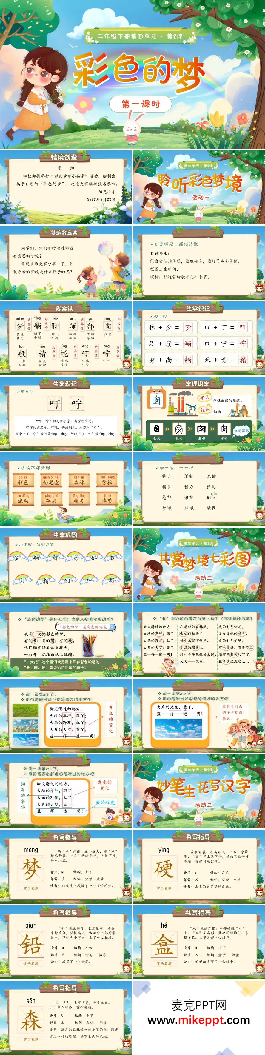 这是一套专为小学语文二年级下册《彩色的梦》第一课时量身定制的教学课件,整体视觉呈现清新雅致、童趣十足,以生机盎然的森林秘境与青翠绵延的草地原野作为背景基调,巧妙搭配活泼灵动的卡通人物形象,完美契合低龄学生的认知发展水平与审美情感需求,营造出如梦似幻、引人入胜的诗意学习空间。 课件开篇匠心独运地设计"彩色梦境小画家"活动通知作为情境导入,以班级即将举办梦境绘画展览的真实任务激发学习期待。随后通过"梦境分享会"互动环节,引导学生自由交流自己曾经做过的奇妙梦境——或是飞翔云端,或是潜入海底,或是与动物对话——在畅所欲言中快速激活想象经验,自然过渡到课文主题,建立起个人经验与文本内容的情感联结。 识字教学板块系统扎实,层次分明。通过"我会认"环节,借助拼音辅助与图片对照,引导学生准确认读"梦、躺、聊、窗、盒"等本课生字;在"生字识记"板块,灵活运用多元识字策略:运用"加一加"构字法如"林+夕=梦""耳+卯=聊",结合形声字规律如"窗"字穴宝盖与囱声的形义关系,渗透字理识字如"盒"字皿字底与器皿关联,帮助学生在规律探究中建立汉字音形义的有机联系;最后通过"生字巩固"小游戏,如摘苹果、开火车、找朋友等趣味形式,强化记忆效果,实现识字教学的趣味性与实效性统一。 "共赏梦境七彩图"文本初读板块,教师引导学生带着想象朗读诗歌,整体感知彩色铅笔创造的奇妙世界。针对"一大把彩色的梦"这一独特表达,结合生活经验理解量词运用的形象性;聚焦"脚尖滑过的地方,大块的草坪,绿了;大朵的野花,红了;大片的天空,蓝了"等经典段落,引导学生发现排比句式的节奏美感,感受色彩变化的视觉冲击,在反复诵读中体会诗歌语言的韵律之美与画面之美。 "妙笔生花写汉字"书写指导环节,对"梦、硬、铅、森、拉"等本课要求会写的生字进行精细化讲解。从笔画顺序的动态演示,到间架结构的对比分析,再到关键笔画的定位强调,如"梦"字林部与夕部的穿插避让,"硬"字石字旁的窄长形态,"铅"字钅字旁与沿字的协调比例,帮助学生建立规范书写的意识与能力,培养良好的书写习惯。 课堂最后进行系统小结,梳理本课所学的生字新词、优美词句与初步感知的想象之美,布置分层预习任务:熟读诗歌、观察生活中的色彩变化、尝试用彩色铅笔描绘一个小场景,为第二课时深入品味修辞、拓展想象做好充分铺垫。整套课件设计精巧,环环相扣,让学生在充满趣味的互动中夯实语文基础,初步感受儿童诗歌的独特魅力。