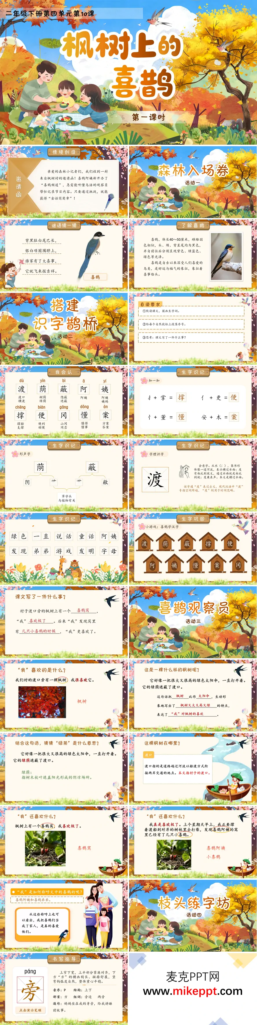 这是一套专为小学语文二年级下册《枫树上的喜鹊》第一课时量身打造的教学课件,整体视觉呈现以绚烂多姿的秋日枫树林作为背景基调,金黄火红的枫叶层层叠叠、摇曳生姿,巧妙搭配温馨的野餐场景插画与灵动可爱的喜鹊元素,自然气息浓郁、童趣氛围十足,营造出温暖诗意、引人入胜的学习情境,完美契合低年级学生的审美偏好与情感需求。 课件开篇以"森林小记者"的身份情境创设巧妙引入,教师宣布班级将成立"枫树观察站",招募热爱自然的小记者记录枫树上的故事。随后通过趣味谜语"嘴尖尾巴长,飞到枝头叫,难道它只会,捉虫本领强"激发探究兴趣,在"了解喜鹊"知识板块中,借助图文资料简要介绍喜鹊的外形特征、生活习性与吉祥寓意,帮助学生建立对观察对象的初步认知,为深入文本学习奠定情感基础。 紧接着进入"搭建识字鹊桥"核心教学环节,系统落实识字写字目标。教师灵活运用多元识字策略:通过"加一加"构字法,如"氵+度=渡""艹+阴=荫",帮助学生建立字形组合规律;结合形声字特点,分析"蔽"字艹字头表意、敝表音的构字原理;渗透字理识字,讲解"渡"字与水相关的本义溯源。在掌握"渡、荫、蔽、撑、拼"等生字的基础上,嵌入"喜鹊学汉字"互动小游戏,学生正确认读即可帮助卡通喜鹊搭建过河鹊桥,在寓教于乐中强化记忆效果,实现识字教学的趣味性与实效性统一。 课文感知板块设置"喜鹊观察员"学习任务,引导学生带着问题初读课文,梳理"我喜欢枫树——我喜欢喜鹊窝——我喜欢喜鹊阿姨和弟弟"的清晰脉络。重点聚焦"枫树好像一把很大又很高的绿色太阳伞"这一经典比喻句,通过实物联想与图片对比,引导学生发现本体与喻体的相似特征,体会作者对枫树形态与色彩的细腻观察;结合"遮蔽""绿荫""渡口"等关键词句的品读,感受"我"对枫树与喜鹊深深的喜爱之情,初步建立读者与文本的情感联结。 "枝头练字坊"书写指导模块,对"窝、阿、姨、弟、便"等本课要求会写的生字进行精细化讲解。从笔画顺序的动态演示,到间架结构的对比分析,再到关键笔画的定位强调,如"窝"字穴宝盖与呙部的协调比例,"阿"字左耳旁与可部的穿插避让,"姨"女字旁与夷部的变形规律,帮助学生建立规范书写的意识与能力,培养良好的书写习惯。 课堂最后进行系统小结,梳理本课所学的生字新词、比喻修辞与初步感知的喜爱之情,布置观察性预习作业:观察校园或小区里的树木与小鸟,尝试用一句话描述它们的姿态,为第二课时深入品味对话、拓展想象做好充分铺垫。整套课件设计精巧,环环相扣,让学生在趣味互动中夯实语文基础,初步感受散文语言的独特魅力,建立起对大自然生命的温情关注。