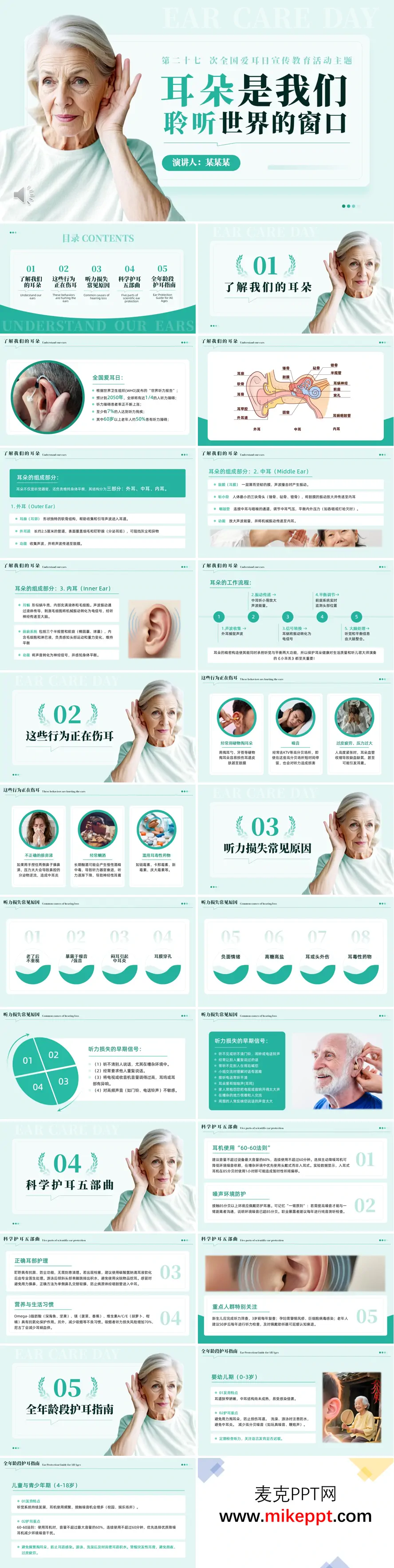 以下是根据文档内容整理的PPT核心内容介绍,结构清晰分为五个部分: 一、耳朵结构与功能 PPT首先通过解剖图展示耳朵的精巧构造,分为外耳、中耳、内耳三部分。 外耳负责收集声波,中耳通过听小骨放大振动,内耳的耳蜗将声波转化为神经信号,前庭系统则维持身体平衡。 二、伤耳行为警示 硬物掏耳易损伤耳道;高分贝环境(如KTV)可造成噪音性听力损失;压力过大导致耳部缺血,甚至突发耳聋。其他危险行为包括错误擤鼻涕引发中耳炎、酗酒加速听力衰退等。 三、听力损失成因与信号 PPT以图标形式归纳了老年衰退、噪音暴露、药物毒性等主要原因,并列出早期预警信号,如听不清对话、耳鸣、需调高设备音量等,提示用户及时关注听力变化。 四、科学护耳指南 核心内容为“护耳五部曲”:强调耳机使用遵循60-60法则(音量≤60%,时长≤60分钟),噪音环境佩戴防护耳塞,正确护理耳道避免过度清理,补充护耳营养素(如Omega-3、维生素),并针对婴幼儿、老年人等重点人群提出筛查建议。 五、全年龄段防护策略 最后部分按年龄分层给出具体建议:婴幼儿侧重防感染,青少年需规范耳机使用,成年人避免职业噪音损伤,老年人则需控制慢性病并定期检查。配图强化了游泳后及时干燥耳道、远离高强度噪音等实用技巧。 整套PPT通过严谨的结构、数据支撑及可视化图片,系统性地传递了爱耳护耳的科学知识,兼具科普性与实践指导价值。