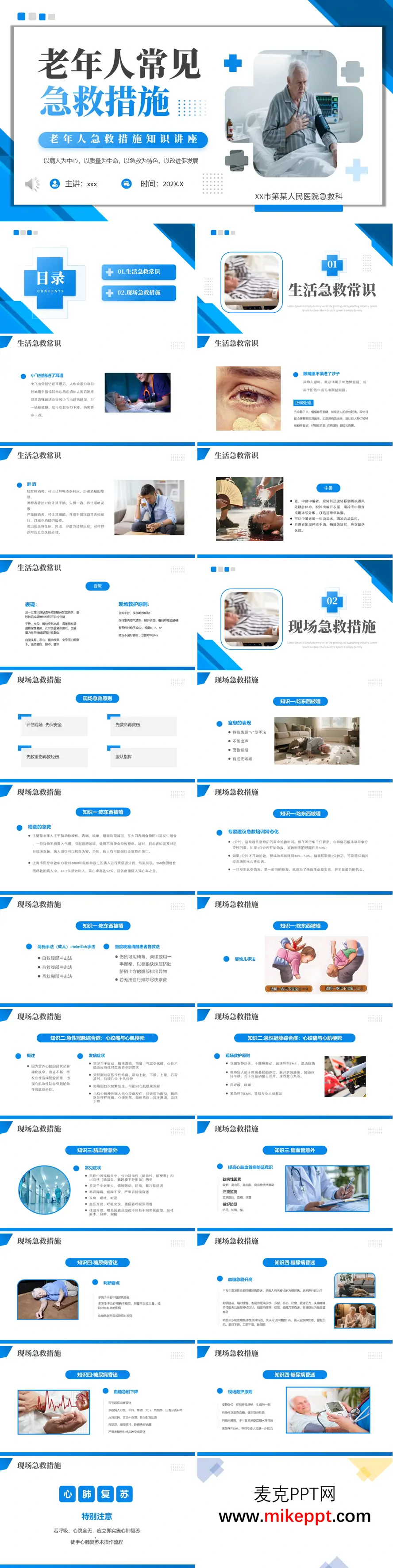 这套PPT文档以"老年人常见急救措施"为主题,系统介绍了老年人群在日常生活中可能遇到的突发健康问题及相应的急救方法。内容分为生活急救常识和现场急救措施两大部分,结构清晰,重点突出。 在生活急救常识部分,文档详细讲解了小飞虫钻入耳道的正确处理方式,强调避免盲目掏挖;针对眼睛进沙的情况,说明应冷静处理,通过眼泪自然排出或轻柔翻开眼皮检查;对于醉酒和中暑,分别介绍了喝浓茶利尿、冷敷降温等实用方法;同时还涵盖了昏厥的识别与应急处理。 现场急救措施部分更具专业性,重点演示了海姆立克急救法应对噎食窒息,包括成人自救腹部冲击法和婴幼儿特殊手法。文档还深入分析了急性冠脉综合征(心绞痛、心肌梗死)和脑血管意外(中风)的典型症状与急救原则,强调立即平卧、保持安静、及时呼叫专业救援的重要性。 特别值得关注的是,文档通过清晰的流程图解,逐步演示了徒手心肺复苏术(CPR)的标准操作流程,从环境评估、意识判断到胸外按压、人工呼吸的完整步骤,并强调按压频率100次/分、深度4-5厘米等技术要点。这些内容都体现了"以病人为中心,以急救为特色"的核心理念,为老年人急救知识普及提供了专业、实用的指导。