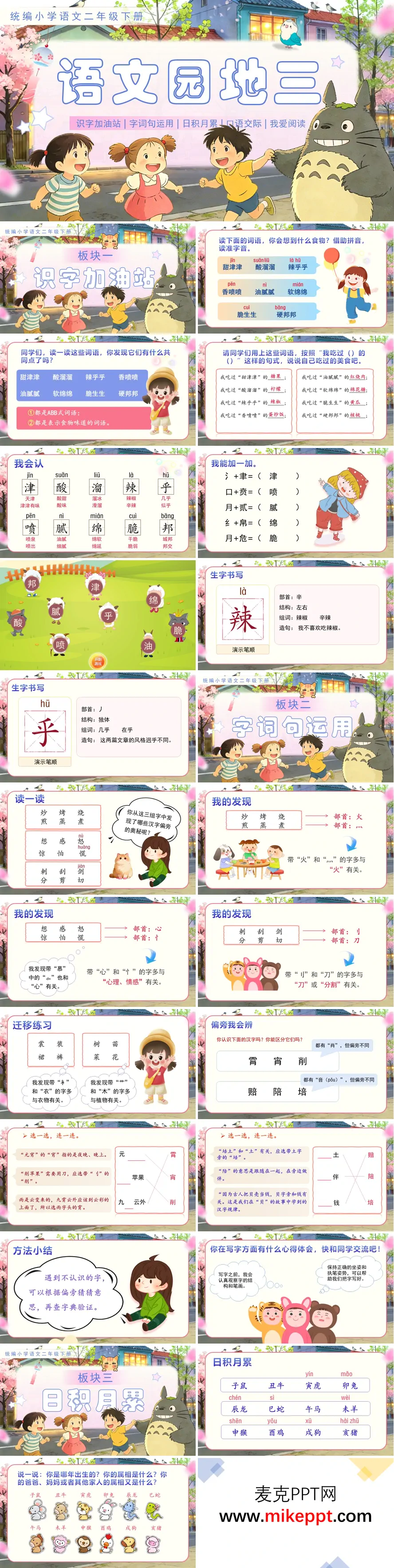 这套统编版小学语文二年级下册《语文园地三》教学课件,整体风格童趣盎然,采用卡通插画与模块化布局,契合低年级学生的认知特点,助力知识巩固与能力提升。课件涵盖五大核心板块:识字加油站聚焦"甜津津、酸溜溜"等ABB式味觉形容词,通过拼音认读、构字规律解析及"我吃过……"情境句式,夯实字词根基;字词句运用板块引导学生探究"火、灬、心、忄、刂、刀"等偏旁的表意规律,并以"霄、宵、削""赔、陪、培"等形近字开展辨析训练,渗透识字方法;日积月累板块以十二生肖为主题,详解十二地支与生肖的对应关系,辅以相关成语故事,拓展传统文化视野;口语交际板块围绕"身边的职业"展开,借助范例引导与小组合作,鼓励学生清晰阐述职业理想及理由,锻炼表达能力;我爱阅读板块精选诗歌《一株紫丁香》,通过朗读指导与情感启发,引领学生体悟师生情谊,品味文字之美。整套课件寓教于乐,兼顾知识传授与趣味互动,是课堂教学的得力助手。
