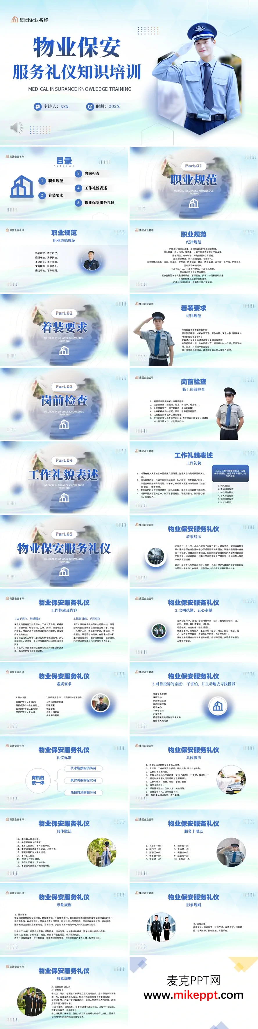 这套PPT以“物业保安服务礼仪知识培训”为主题,内容结构清晰,分为职业规范、着装要求、岗前检查、工作礼貌表述和物业保安服务礼仪五个主要部分。整体旨在系统化提升保安人员的职业素养与服务形象。 PPT开篇明确了保安人员的职业道德与纪律规范,强调爱岗敬业、遵纪守法、文明执勤等基本原则。随后详细规定了着装标准,要求制服整洁、仪容得体,展现专业形象。岗前检查环节则聚焦细节,从制服整理到工具性能确认,确保上岗前准备充分。 在工作礼貌表述部分,PPT突出了微笑服务、主动问候等人性化服务要点,并指导如何耐心处理客户查询与投诉。最后,物业保安服务礼仪作为核心,通过案例启示和具体操作标准(如车辆指挥、流动岗查询技巧),强调保安应兼具安全员、服务员等多重角色,实现技术性与礼仪性的统一。 整套内容注重实操性,通过形象规则与禁忌提醒,将服务礼仪落实到站姿、用语、沟通等日常细节,旨在塑造专业、礼貌、可靠的保安团队形象。