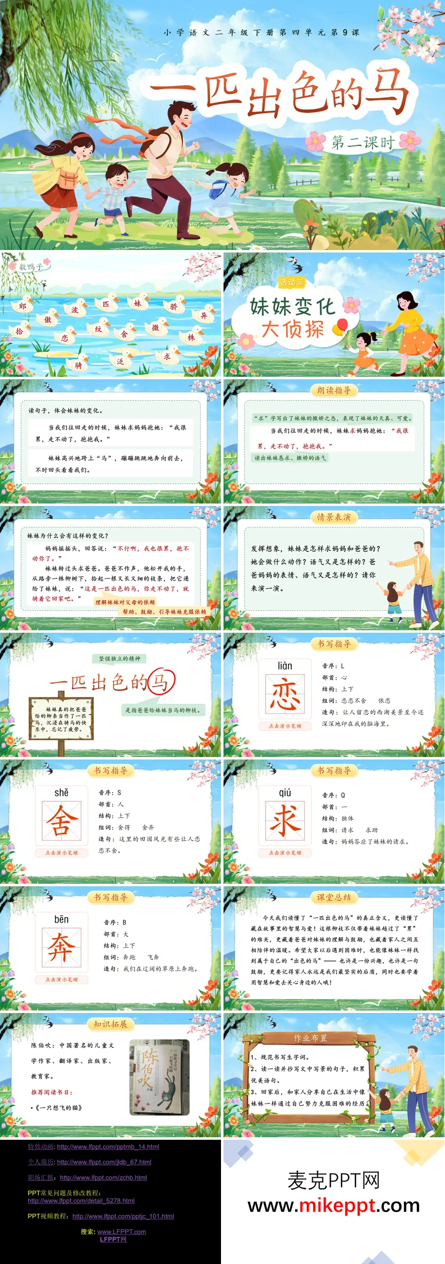 这是一套专为小学语文二年级下册第四单元第9课《一匹出色的马》第二课时精心设计的教学课件,整体风格清新活泼、明快灵动,紧扣课文核心教学要点,构建起层次清晰、趣味盎然的课堂结构,引导学生在品读探究中感悟文本深意。 课件开篇封面以生机勃发的春日郊外作为背景画面,嫩绿的柳枝轻拂,粉红的桃花绽放,搭配温馨和谐的亲子出游插画,一家人骑行漫步于田园风光之中,直观点明课题与课时主题,瞬间将学生带入课文所描绘的美好情境。 随后的"生字乐园"巩固板块,系统呈现"郊、波、恋、舍、求"等本课重点生字,每个生字均标注规范拼音,搭配"郊外、波浪、恋恋不舍、舍得、请求"等常用组词,通过多种形式的认读练习,帮助学生强化记忆、夯实识字基础,为深入文本研读扫清字词障碍。 核心教学板块"妹妹变化大侦探"巧妙设计探究任务,引导学生聚焦课文关键语句,化身小侦探细致观察妹妹在郊游返程过程中的状态变化。通过对比分析,学生清晰发现:起初妹妹"求妈妈抱"时的疲惫撒娇,与得到爸爸递来的"马"之后"蹦蹦跳跳地奔向前去"的兴奋雀跃,形成鲜明反差。教师顺势引导体会这一心情变化的内在原因,为理解"出色的马"的深层内涵做好铺垫。 "朗读指导"环节精心标注重点词句,针对妹妹求抱时"我很累,走不动了,抱抱我"的恳求语气,以及骑"马"后"我早回来啦"的欢快语调,进行分层次、有梯度的朗读训练,让学生在声音的抑扬顿挫中走进人物内心。"情景表演"互动环节鼓励学生分组还原人物对话与动作,通过角色扮演深化对文本情境的理解,在具身体验中感受语言的生动与情感的真挚。 课件重点解析"出色的马"这一核心意象的丰富内涵——引导学生发现这匹"马"实则是一根细长柔软的柳枝,却因其承载了爸爸的巧妙鼓励与教育智慧,成为帮助妹妹战胜疲劳、学会独立的精神力量。这一设计将实物认知与情感体悟相结合,让学生在恍然大悟中领会父爱的深沉与成长的真谛。 "书写指导"板块详细示范"恋、舍、求、奔"等本课要求会写的生字,从笔顺规则的动态演示,到间架结构的精细分析,再到组词运用的语境拓展,如"恋恋不舍"的成语积累,帮助学生全面掌握汉字书写的规范与美感。 课堂最后进行系统总结,升华"独立成长"的主题意蕴,结合知识拓展板块简要介绍作者陈伯吹的生平与创作成就,让学生了解文本背后的文学背景。分层作业设计兼顾基础与提高:基础层抄写生字、朗读课文,提高层积累文中写景语句、讲述自己的成长小故事,引导学生在语言实践中感悟成长与独立的意义,实现语文素养与人文教育的有机融合。
