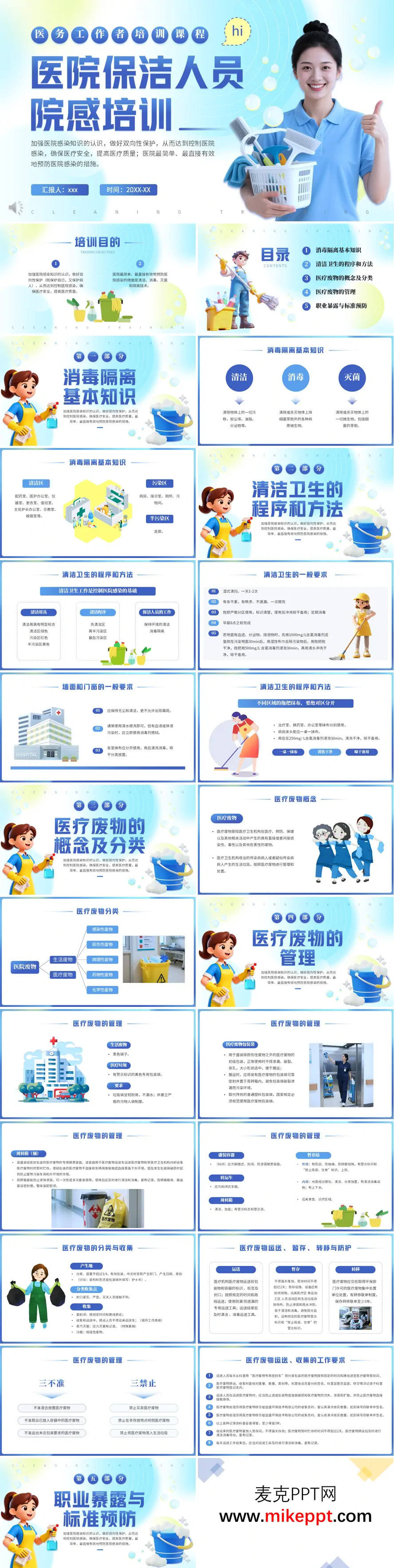 这份PPT培训材料主要面向医院保洁人员,核心目标是加强其对医院感染知识的认识,通过做好双向性保护(既保护自己,也保护病人),从而控制医院感染,确保医疗安全,提升医疗质量。 材料内容围绕几个关键模块展开:首先介绍了消毒隔离的基本知识,明确了清洁、消毒、灭菌的概念以及清洁区、污染区、半污染区的划分。其次,详细阐述了清洁卫生的程序与方法,强调湿式清扫、分区使用清洁用具(如不同颜色标识的拖把和抹布)以及“一桌一抹布”等具体操作规范。第三部分重点讲解了医疗废物的概念、分类(如感染性、损伤性废物等)及其严格的管理要求,包括专用包装袋、周转箱的使用以及“三不准三禁止”原则。最后,材料涵盖了职业暴露的预防与处理,指导保洁人员在发生锐器伤等意外时如何紧急处理,并强调了标准预防措施的重要性,如手卫生和佩戴防护用品。 整体而言,这套PPT系统性地为保洁人员提供了医院感染控制的基础知识与实操指南,突出其在医院感控体系中的基础性作用。