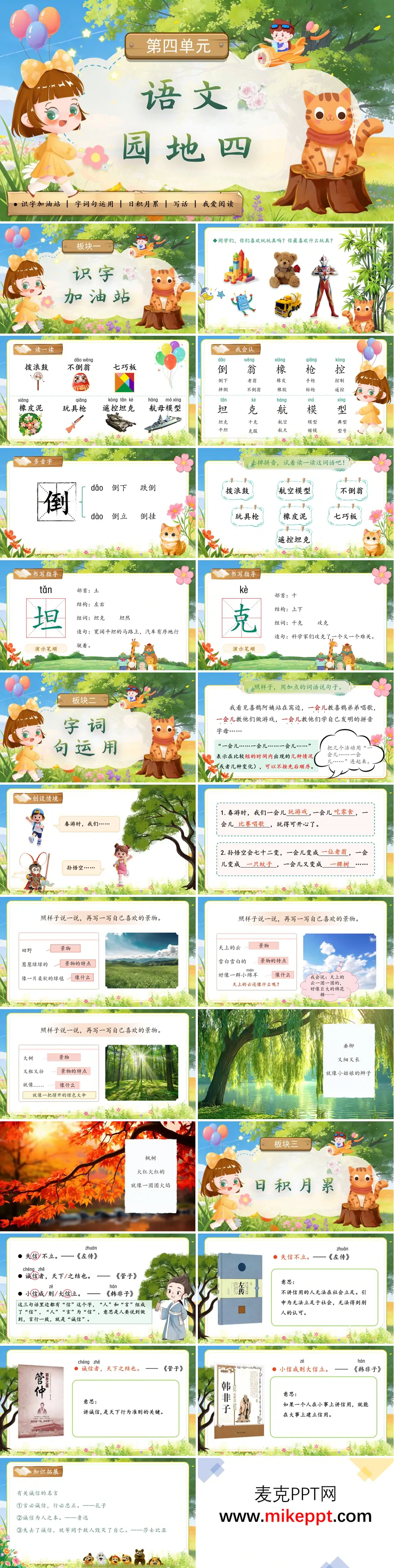 这是一套专为小学语文二年级下册第四单元《语文园地四》精心设计的教学课件,整体风格童趣盎然、活泼灵动,紧密围绕"识字加油站、字词句运用、日积月累、写话"四大核心模块展开,充分贴合低年级学生的学习特点与认知规律,构建起扎实而丰富的语文实践平台。 "识字加油站"板块巧妙创设"玩具总动员"的趣味情境,以孩子们熟悉的拨浪鼓、七巧板、遥控坦克、溜溜球、积木等玩具类词汇作为识字载体,将语言学习与生活经验有机融合。教学中重点落实"倒"这一多音字的辨析,通过"摔倒""倒车"等不同语境的对比,帮助学生掌握其读音变化与用法区别;同步进行"坦、克、控、陀"等生字的系统教学,从拼音认读、部首分析、结构观察到组词造句,多维度夯实字词基础,让学生在喜闻乐见的玩具世界中快乐识字。 "字词句运用"模块聚焦两大核心训练点。一是"一会儿……一会儿……一会儿……"的排比句式教学,教师巧妙结合春游活动、孙悟空变化等学生熟悉的生活与童话情境,设计分层练习:从填空补全到仿说句子,再到自主创编,引导学生学习表达同一主体在不同时间段连续进行的多个动作,培养语言的连贯性与丰富性。二是景物描写能力提升,通过"田野葱葱绿绿的,像一片柔软的绿毯""天上的雪白雪白的,好像一群小绵羊"等典型示例,搭配ABAB式色彩词语的积累运用与比喻修辞的初步感知,指导学生将观察到的景物写具体、写生动,落实语言建构与运用目标。 "日积月累"板块精选中华传统文化经典,收录《左传》"失信不立"、《管子》"诚信者,天下之结也"、《韩非子》"小信成则大信立"等关于诚信的名言警句。教学中辅以浅显易懂的现代释义,帮助学生理解诚信对于立身行事的重要价值;同步拓展"言必信,行必果"等相关名言,在诵读积累中自然渗透诚信育人的核心理念,实现语言积累与品德修养的双重提升。 "写话"与"我爱阅读"板块形成读写联动的有机整体。写话任务以"小虫子、蚂蚁和蝴蝶用蛋壳做了什么"为创意主题,提供"早上、过了一会儿、到了下午、天黑了"等时间词支架与四幅情境连环图,引导学生细致观察画面、合理展开想象、完整连贯表达,在趣味故事中练习写话的基本方法。"我爱阅读"则搭配相关绘本阅读指导,推荐《半个蛋壳》等拓展读物,引导学生在课外阅读中延续学习兴趣,兼顾语言运用与阅读积累,全面提升学生的语文综合素养。 整套课件模块清晰、内容丰富,从趣味识字到句式训练,从景物描写到名言积累,从想象写话到拓展阅读,形成了完整而开放的语文学习链条,充分体现了《语文园地》作为单元知识整合与能力迁移平台的编写意图,有效促进学生语文素养的全面发展。