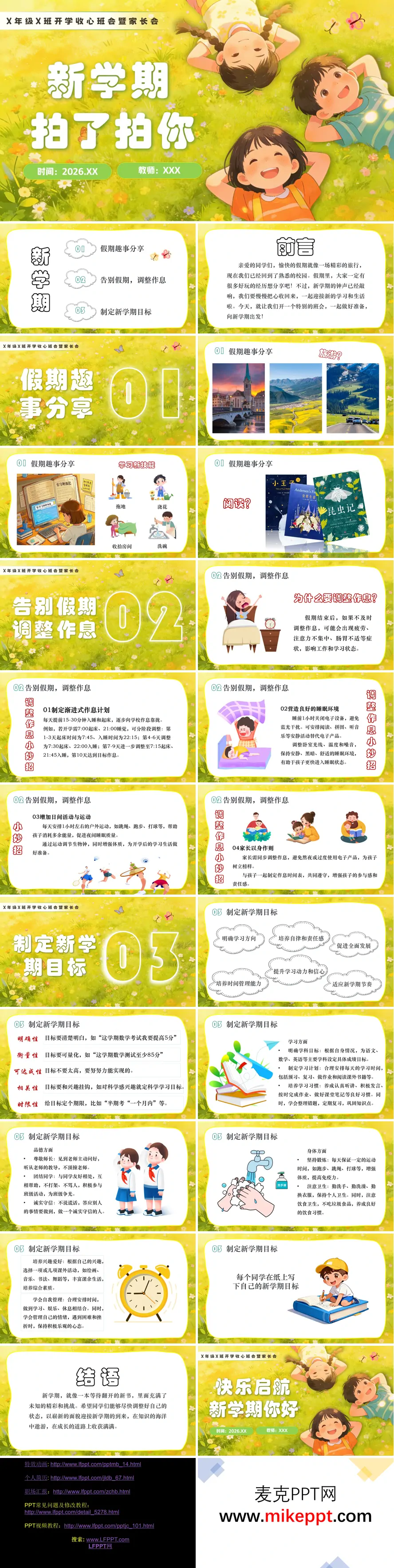 这套开学收心班会PPT以"新学期拍了拍你"为主题,采用清新治愈的黄绿草地插画风格,视觉明快温馨,既适合课堂氛围营造,也便于家校沟通。内容设计层层递进:开篇以温暖前言点题,随后设置"假期趣事分享"环节,通过旅游见闻、技能学习、阅读感悟等多元场景,引导学生回顾假期收获;紧接着聚焦"告别假期,调整作息"板块,从作息调整的必要性切入,系统讲解渐进式计划制定、睡眠环境优化、日间运动增加及家长示范等实用策略,助力学生平稳过渡;之后进入"制定新学期目标"核心环节,结合SMART原则(明确性、可衡量性、可达成性),从学业发展、品德修养、身体素质、兴趣培养四个维度指导学生设立具体可行的成长目标,并鼓励现场书写新学期计划;最后以"快乐启航,新学期你好"的积极结语收尾,传递美好期许,激励学生以昂扬姿态开启崭新征程。整套课件逻辑清晰、互动性强,兼具教育性与趣味性。
