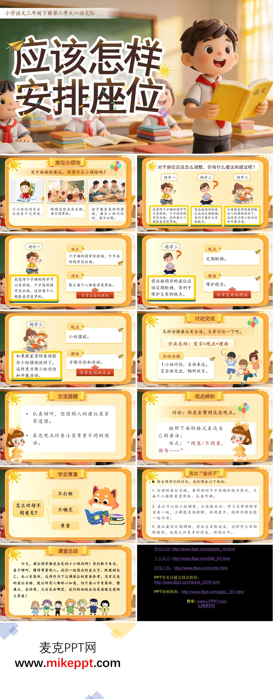 这是一套专为小学语文二年级下册第六单元口语交际课《应该怎样安排座位》精心研发的教学课件,以"解决班级实际问题"作为核心设计理念,将语文学习与学生真实生活紧密联结,整体兼具实用价值与互动趣味,充分体现口语交际课程的实践性特征。 课件开篇以"座位小烦恼"的真实情境巧妙切入,通过呈现班级中常见的具体问题——如个子较矮的同学坐在后排看不清黑板、视力不佳的同学长期固定座位导致用眼疲劳、同桌之间身高差异过大影响学习等——迅速引发学生的情感共鸣与表达欲望,让他们意识到座位安排并非小事,而是关乎每个人学习效果与课堂体验的重要议题,从而自然激发参与讨论、寻求解决方案的主动性。 随后,课件系统展示三种具有代表性的核心观点,为学生搭建思维支架与表达范例。第一种"按身高排座"强调兼顾视力保护,让每位同学都能清晰看到黑板;第二种"定期轮换座位"突出公平实用原则,确保每位同学都有机会体验不同位置;第三种"小组合作式摆放"则关注学习互动需求,便于开展课堂讨论与互助学习。每种观点均配以简明扼要的阐述,帮助学生理解"观点+理由"的基本表达框架,为后续的自主发言提供可借鉴的范式。 中间环节设计"讨论交流"核心板块,引导学生开展小组合作学习与全班分享展示。教师明确口语交际的关键要求:发言时要条理清晰,先表明观点再说清理由,声音响亮让全班听见;倾听时需尊重他人,眼睛注视发言人,不随意插话打断。通过角色示范与即时评价,逐步培养学生良好的交际习惯。"观点辨析"进阶板块则借助固定句式支架,如"我同意XX的观点,因为……""我有不同看法,我认为……",训练学生在认同或质疑时有理有据地表达,初步发展批判性思维与思辨能力。 课件特别融入"学会尊重"的交际礼仪专题指导,通过情境辨析与儿歌总结,教导学生以不打断他人发言、不嘲笑不同意见、耐心听完再回应的态度对待多元观点,在语言实践中渗透文明交往的品德教育,实现工具性与人文性的有机统一。 最后总结环节师生共同提炼"金点子",综合各方合理建议,形成兼顾身高因素、视力保护、小组互助与定期轮换的优化方案,让讨论成果真正落地为可操作的班级公约。主题升华部分引导学生认识到,座位安排的本质是集体生活中的协商与谦让,每个人既要维护自身合理需求,也要体谅他人特殊情况,逐步树立集体意识、规则意识与合作精神。 整节课紧扣口语交际课程"倾听、表达、应对"三大核心要点,既落实了"清楚表达观点、说明理由"的表达训练目标,又培养了"认真倾听、尊重他人、文明应对"的社交素养,让学生在解决真实问题的过程中,切实提升口语交际能力与综合人文修养。
