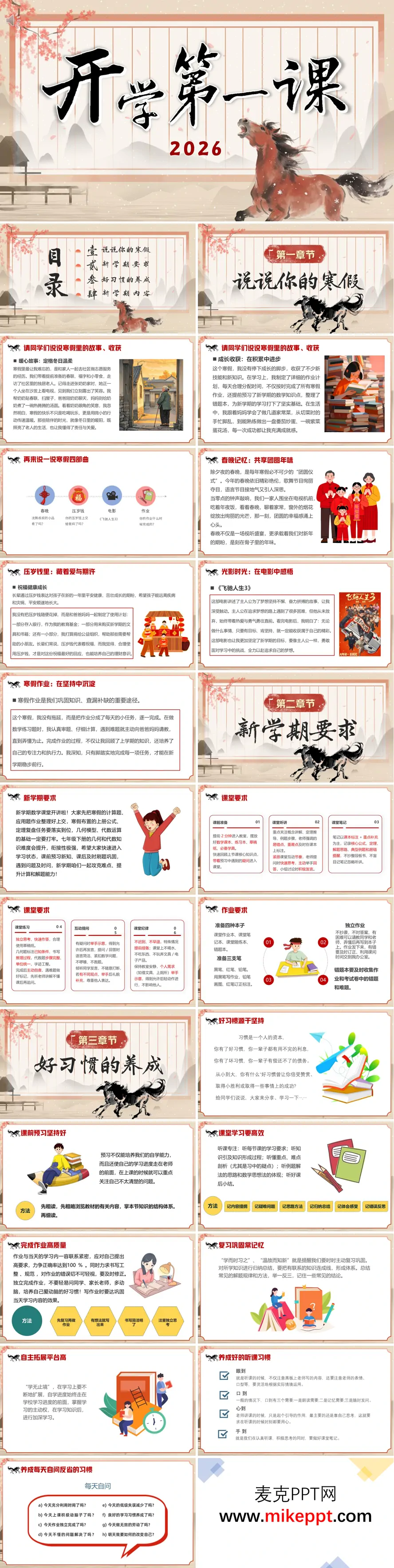 这套2026年"开学第一课"PPT以水墨国风骏马为核心视觉意象,整体风格典雅庄重,既彰显传统文化气韵,又契合开学节点的仪式感与实用导向。课程架构层层递进,四大板块环环相扣:首章"说说你的寒假"以情感共鸣切入,通过暖心故事分享、成长收获盘点及"寒假四部曲"(春晚记忆、压岁钱规划、观影感悟、作业复盘)等多元维度,引导学生温情回顾假期生活;次章"新学期要求"立规明矩,从课前准备、课堂纪律到课后复盘,逐项细化行为标准与学业规范;第三章"好习惯养成"授之以渔,系统拆解课前预习策略、高效听课技巧、高质量作业标准及自主拓展路径,为学生构建科学学习方法论;末章"新学期内容"纲举目张,全面梳理人教版、北师大版、华师大版等主流初中数学教材的知识体系与重难点分布,助力学生前置建立学科认知地图。整套课件情理交融,既以人文关怀唤醒学习内驱,又以专业指导夯实能力根基,为新学期征程注入稳健底气与昂扬动力。