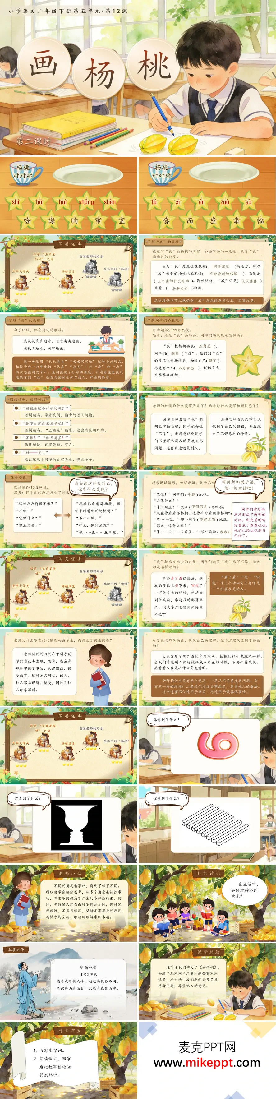 这是一套专为小学语文二年级下册《画杨桃》第二课时精心研发的课堂教学课件,整体设计风格清新雅致、童趣盎然,兼具互动参与性与思维启发性,能够有效引导学生深入文本、探究道理,是一套优质的教学辅助工具。 课件以"杨桃对对碰"趣味游戏巧妙开场,通过生字卡片配对、词语认读抢答、拼音与汉字连线等游戏化形式,快速复习"室、哈、诲、晌、审、嘻、而、座、肃、幅"等第一课时学过的重点生字,在轻松愉悦的氛围中激活记忆、巩固基础,为新课的深度研读做好充分铺垫。 课文理解环节聚焦故事发展的核心脉络,层层递进地引导学生探究"我"画杨桃、同学们嘲笑、老师循循善诱的关键情节。首先通过句子对比品读,将"我认认真真地看,老老实实地画,自己觉得画得很准确"与同学们的随意态度进行对照,引导学生圈画"认认真真""老老实实"等关键词,深入体会"我"严谨踏实、尊重事实的作画态度。继而通过多层次朗读指导,让学生用嘲笑、讥讽的语气读"倒不如说是五角星吧",再用不好意思、难为情的语调读"不……像""像……五……五角星",在声调的起伏变化中感受同学们从盲目自信到亲眼见证后的羞愧转变,理解认知偏差的修正过程。特别聚焦老师的教育智慧,细致分析"看了看""走到""坐""审视"等一系列连贯动词,突出老师不急于评判、亲自观察验证的实事求是精神,展现循循善诱的教育艺术。 课件精心设置"你看到了什么"视觉互动游戏,利用同一物体从不同角度拍摄的照片或简笔画,让学生现场体验"横看成岭侧成峰"的观察差异,直观展示"角度不同,结果不同"的深刻道理。在此基础上,巧妙链接苏轼《题西林壁》经典诗句"横看成岭侧成峰,远近高低各不同",将语文学习拓展至古诗积累,在跨文本印证中深化对观察相对性与多元视角的理解,提升文化品位与思维深度。 课堂最后通过教师精要小结,凝练概括"实事求是、多角度思考、尊重他人看法"的核心主旨;组织小组讨论"生活中还有哪些事情需要换个角度想一想",引导学生将课堂所学迁移至真实生活情境;布置分层实践作业:给家人讲述《画杨桃》的故事,观察记录生活中因角度不同而产生不同看法的事例。整套课件实现了知识学习、思维发展与品格培养的有机融合,让学生在充满趣味的互动中学会理解包容、尊重事实,成长为善于思考、懂得换位的小公民。