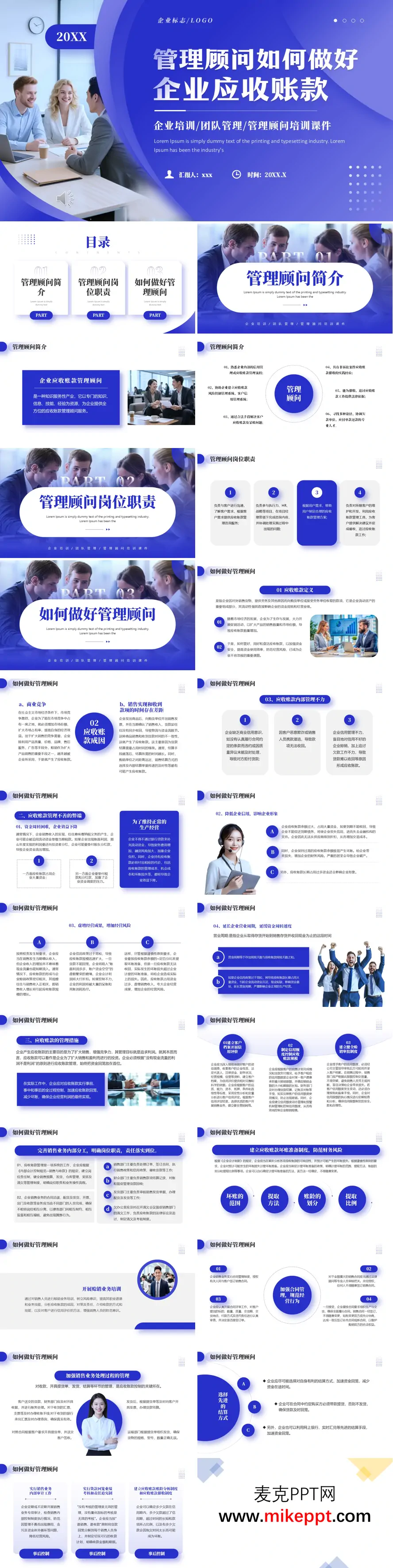 这套PPT课件旨在为管理顾问提供关于企业应收账款管理的系统性培训。内容核心围绕“企业应收账款管理顾问”的角色与职责,深入剖析了应收账款的相关知识、管理不善的弊端以及全面的管理措施。 PPT开篇对企业管理顾问进行了简介,将其定位为以知识、信息、技能和经验为资源,为企业提供全方位应收账款管理服务的专业角色。随后明确列举了管理顾问的岗位职责,包括与客户沟通需求、参与咨询项目、制定管理方案、利用工具提供催收建议并维护客户关系等。 课件重点阐述了“如何做好管理顾问”。首先,它定义了应收账款是企业因销售货物、提供劳务等应向购货单位收取的款项,是流动资产的重要组成部分。其次,详细分析了应收账款形成的三个主要原因:商业竞争导致的赊销、销售实现与收款时间存在差距,以及企业内部管理不力。接着,系统性地论述了应收账款管理不善的四大弊端:导致资金周转困难、降低企业信用、虚增经营成果以及延长营业周期。 最后,也是最重要的部分,PPT提出了一套完整的应收账款管理措施,涵盖事前、事中和事后控制。具体包括:建立客户档案并开展信用评价、制定信用额度以控制规模、建立健全赊销审批制度、完善内部分工与岗位职责、建立坏账准备制度、加强合同管理、优化业务处理流程、选择有利结算方式、实行内部审计,以及建立账龄分析、催收、对账和专题会议等事后监控与考核机制。整个课件强调,管理顾问应帮助企业根据成本效益原则制定合理的信用政策,并将货款回笼置于首位,通过全过程控制来加速资金回流、防范经营风险。