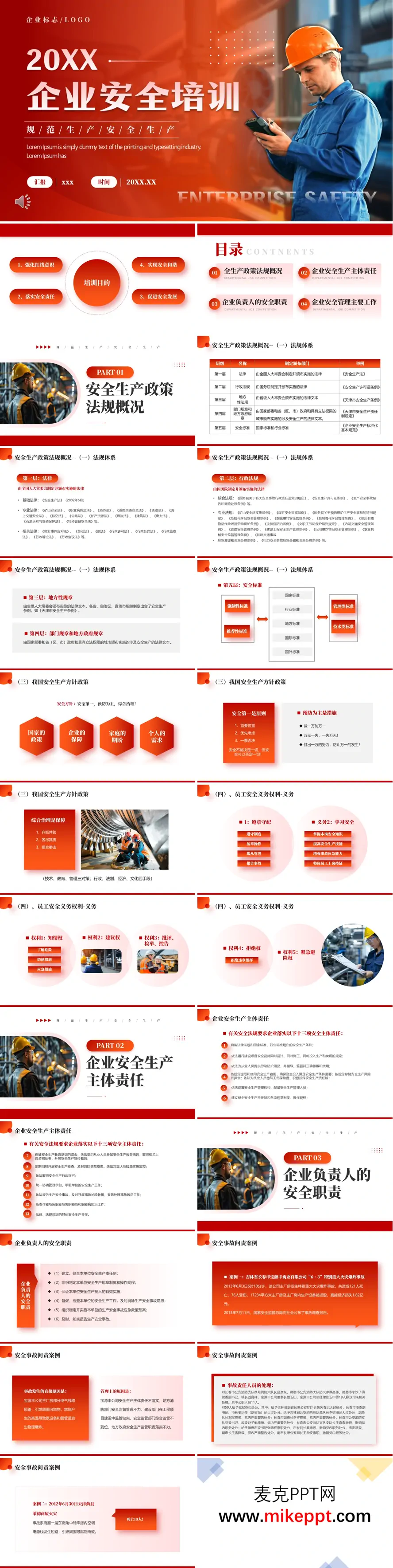 这套PPT是关于企业安全培训的材料,主要围绕“规范生产,安全生产”的核心主题,系统地阐述了企业安全生产的各个方面。其主要内容可以概括为以下四个部分: 1.安全生产政策法规概况:这部分介绍了我国安全生产的法规体系,将其分为法律、行政法规、地方性法规、部门及地方政府规章、安全标准五个层级,并列举了各层级的典型法规,如《安全生产法》、《安全生产许可证条例》等。同时,强调了“安全第一,预防为主,综合治理”的安全生产方针,并详细解释了其含义。最后,明确了员工在安全生产中应尽的义务(如遵章守纪、学习安全)和享有的权利(如知情权、拒绝违章指挥权等)。 2.企业安全生产主体责任:此部分详细列出了法律法规要求企业必须落实的十三项安全生产主体责任。这些责任涵盖了从具备安全生产条件、保障安全投入(费用、保险)、设置安全管理机构、建立健全规章制度,到组织安全培训、开展安全检查、管控重大危险源、取得安全许可、协调承包商管理、报告和处理事故以及防治职业危害等全过程、全方位的法定义务。 3.企业负责人的安全职责:重点明确了企业主要负责人的六项法定安全职责,包括建立健全责任制、制定规章制度和操作规程、保证安全投入、督促检查工作、组织制定应急预案以及及时报告事故。文档还通过“吉林省长春市宝源丰禽业有限公司火灾爆炸”和“天津蓟县莱德商厦火灾”两个真实的安全事故问责案例,以触目惊心的伤亡数字和严厉的追责结果,警示落实领导责任的极端重要性。 4.企业安全管理主要工作:这是PPT的操作核心,具体指导企业如何开展日常安全管理。其核心工作包括: 危险源辨识、评价与控制:详细介绍了危险源、风险等概念,运用“能量意外释放理论”和“三三六过程方法”(三种状态、三种时态、六种类型)来系统识别各类危险源(物理性、化学性、生物性、心理生理性等),并提出了从“消除”到“个体防护”的层级控制策略。 建立安全规章制度:说明了如何依据法规建立并持续改进企业的安全管理制度体系。 开展安全培训教育:概述了从师资、教材到策划、授课、评估的完整培训流程。 组织安全检查:强调了经常性检查、及时处理和记录报告的要求。 事故处理与应急管理:明确了事故处理流程(救人、报告、调查、四不放过)和应急管理的重要性,纠正了“重预防、轻应急”的误区,介绍了应急管理“预防、预备、响应、恢复”四个阶段的内涵,并普及了报火警、常用灭火方法等基本常识。 整体而言,这份PPT材料结构清晰,内容全面,从国家法规、企业责任、领导职责到具体的管理方法和工作要点,层层递进,旨在全面提升企业的安全管理水平和员工的安全意识与技能。