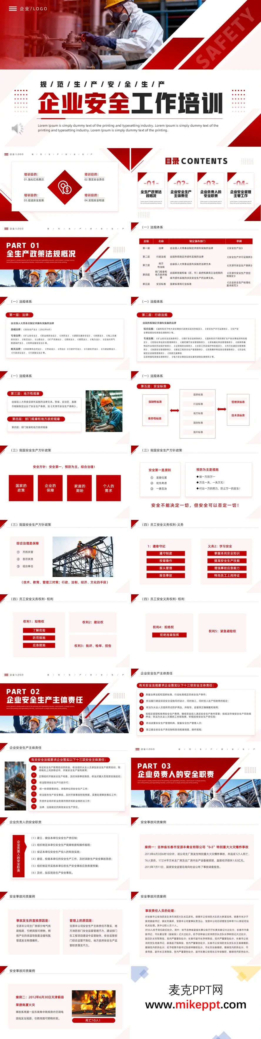 这套PPT的内容主题是关于企业安全生产的培训材料,整体结构分为四大主要部分。 首先,第一部分是安全生产政策法规概况。它系统性地介绍了中国安全生产的法规体系,共分为五个层级:法律(如《安全生产法》)、行政法规(如《安全生产许可证条例》)、地方性法规、部门及地方政府规章,以及安全标准。同时明确了“安全第一,预防为主,综合治理”的国家安全生产方针,并阐述了员工在安全生产中的基本义务(如遵章守纪、学习安全)和权利(如知情权、拒绝违章指挥权等)。 其次,第二部分聚焦于企业安全生产主体责任。文档列举了法规要求企业必须落实的十三项主体责任,涵盖了从保障安全生产条件、履行“三同时”规定、确保安全投入、设置安全管理机构,到建立健全责任制、开展教育培训、隐患排查治理、事故报告与应急处理等全方位的法律义务。 接着,第三部分阐述了企业负责人的安全职责。核心内容包括六项法定职责:建立健全责任制、制定规章制度与操作规程、保证安全投入、督促检查安全生产工作、组织制定并实施应急预案、及时如实报告事故。该部分还通过吉林省长春宝源丰禽业有限公司“6·3”特别重大火灾爆炸事故和天津蓟县莱德商厦火灾等真实案例,详细分析了事故原因,并展示了相关责任人员被移送司法机关和受到党纪政纪处分的严重后果,以此强调落实责任的严肃性。 最后,第四部分详细介绍了企业安全管理的主要工作。这被概括为六个核心执行环节:1) 危险源辨识、评价与控制(介绍了危险源、风险等概念,以及“三三六”辨识方法);2) 安全规章制度的建立与程序化;3) 开展有效的安全培训教育;4) 执行安全检查与考核;5) 事故调查处理与“四不放过”原则;6) 应急管理体系建设(包括常见误区、体系框架及报火警、灭火方法等基本常识)。 整体而言,这套PPT内容从宏观法规到微观操作,从责任界定到实际管理,构建了一套完整的企业安全生产知识与管理实践框架。
