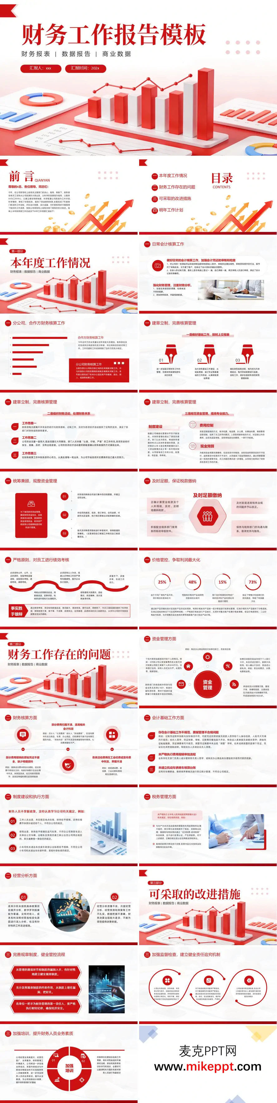 好的。根据您提供的PDF文档内容,这份PPT模板主要围绕“财务工作报告”这一核心主题,系统地展示了一个公司或部门总结财务工作、分析问题、规划未来的完整框架。 PPT的内容结构清晰,分为四个主要部分。第一部分“本年度工作情况”是总结回顾,详细阐述了财务部门在会计核算、财务管理、制度建设(如《固定费用管理办法》)、资金与税务管理以及绩效考核等方面的具体工作和成效。第二部分“财务工作存在的问题”则客观列出了当前工作中暴露的短板,涉及资金管理不规范、财务核算科目混淆、会计基础工作薄弱、制度执行不严以及税务风险等多个具体层面。第三部分“可采取的改进措施”针对前述问题,提出了完善制度、加强监督与培训、严格执行规章等方向性的解决方案。最后,第四部分“明年工作计划”展望未来,重点规划了推进财务信息化建设、加强全面预算管理、深化财务分析以及加强团队与服务建设等重点工作方向。 整体而言,这套PPT模板内容详实、逻辑严密,从一个全面的财务管理工作闭环(总结-问题-改进-计划)出发,为撰写一份专业的财务工作总结与计划报告提供了完整的章节框架和丰富的要点提示。