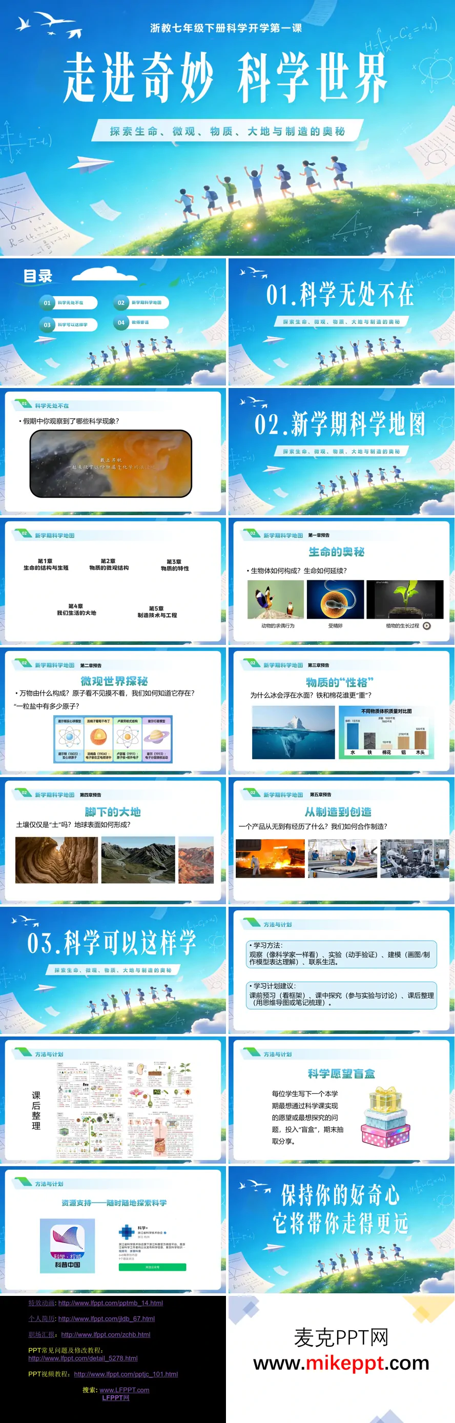 《走进奇妙科学世界》是浙教版七年级下册科学学科的开学第一课课件,致力于点燃学生的科学热情,锚定新学期的探索航向。课件以"科学就在身边"破题,邀请学生回溯假期见闻——从冰雪消融到花开花谢,从厨房里的化学反应到天空中的光学现象,唤醒对科学无处不在的直观感知。 继而展开"新学期科学地图",全景式呈现五大核心模块:窥探生命的精妙构造与繁衍奥秘,潜入微观世界解析物质的内在结构,探究密度、熔点等物理特性背后的规律,解读我们脚下大地的地质变迁,以及领略现代制造技术的工程智慧。每个模块都抛出引人入胜的锚问题,如"宇宙万物究竟由什么构成""为什么冰能漂浮在水面而不下沉",激发探究渴望。 在方法指导层面,课件提炼科学学习的四大支柱:敏锐观察、动手实验、建构模型、联结生活,并细化"预习—探究—整理"的全流程学习策略。特别设置"科学愿望盲盒"互动,让学生写下本学期的科学憧憬。最后汇聚"科普中国"等优质资源平台,勉励学生永葆好奇之心,在观察与提问中开启一段充满惊奇的科学旅程。