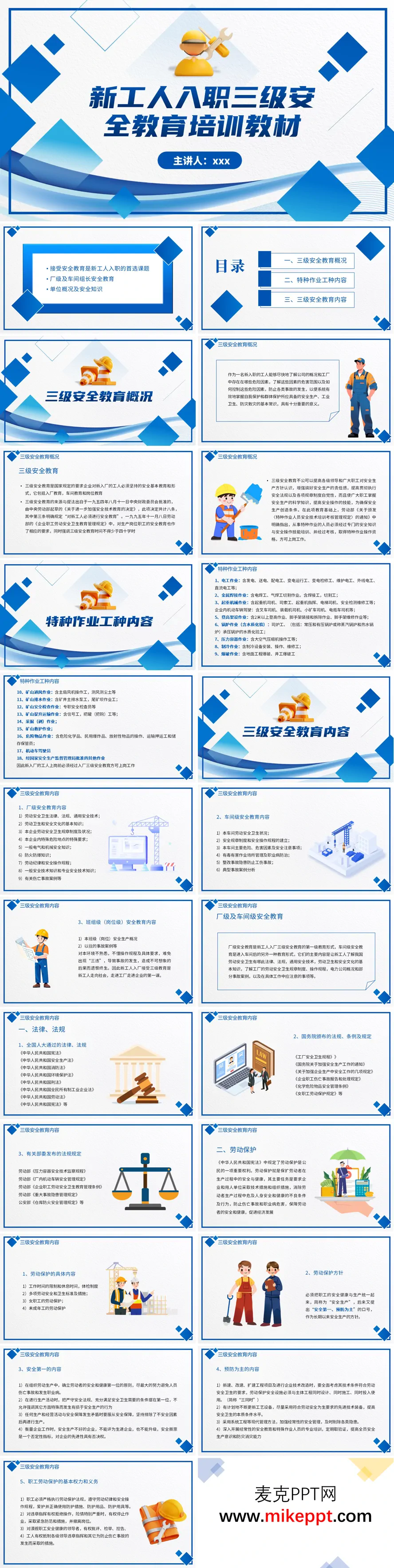 这份题为“新工人入职三级安全教育培训教材”的PPT主要系统地阐述了新员工进入工厂后必须接受的三级安全教育体系。其核心目的是为了让新工人快速了解公司概况、认识工作场所的危险因素,并掌握必要的安全知识与技能,以防止事故发生,确保自身和集体的安全。 PPT内容结构清晰,首先介绍了三级安全教育的定义、法律依据(源自1954年的相关规定,并在1995年的规定中明确了总学时不少于40小时)及其重要意义。其次,详细列举了特种作业工种,如电工作业、金属焊接、起重机械操作等,强调从事这些工种必须经过专门培训并持证上岗。 文档的重点部分详细说明了三级安全教育的具体内容: 1. 厂级教育:涵盖国家安全生产法律法规、通用安全技术、企业规章制度、危险地点、电气机械知识、防火防爆及事故案例等。 2. 车间级教育:聚焦本车间的安全状况、规章制度、主要危险有害因素、职业病防治及事故隐患整改。 3. 班组(岗位)级教育:涉及本岗位安全生产概况、具体操作规程和以往事故案例,是防止因不熟悉环境而导致“三违”(违章指挥、违章作业、违反劳动纪律)的关键一环。 此外,PPT还深入解释了“安全第一、预防为主”的方针,员工的劳动保护权利与义务,以及一系列实用的安全管理知识,如安全色与安全标志、“三不伤害”原则、事故处理“四不放过”原则、交接班制度(“十交五不接”)、设备管理(“四懂三会”)和常用灭火器的使用方法等。 整体而言,这套PPT是一份内容全面、条理清晰的安全培训教材,旨在通过系统化的教育,为新工人奠定坚实的安全生产基础。