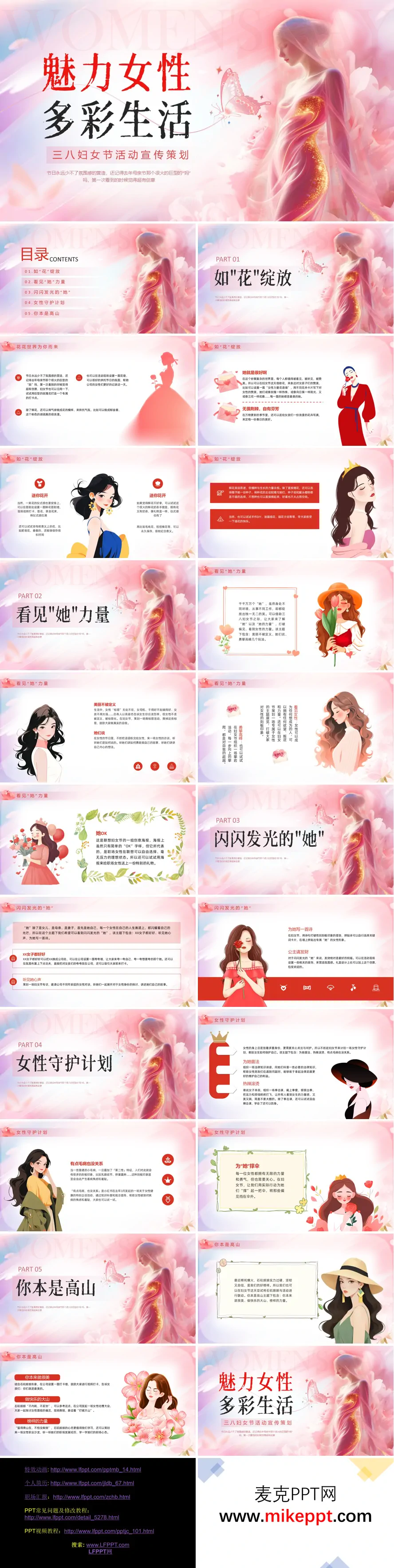这套PPT(或宣传策划文档)的主题是“魅力女性,多彩生活”,内容是关于三八妇女节活动的一系列创意策划方案。 文档共分为五个主要部分。第一部分“如‘花’绽放”围绕“花”的元素展开创意,建议用巨型玫瑰花或花墙打造节日打卡点,烘托浪漫氛围。同时,提出了设置“女性力量花语墙”、赠予鲜花或可长久保存的创意花束(如肥皂花、毛线花)、以及赠送种子或组织插花手作DIY等多种方式,旨在通过花的意象赞美女性的多样美,并赋予活动持久的意义。 第二部分“看见‘她’力量”着重于打破对女性的刻板印象,看见其多元价值。具体玩法包括策划“撕标签”活动消除偏见、举办女性访谈或主题展览来传递女性声音,以及组织攀岩等体现力量感的户外活动。此外,还借鉴了创意海报的形式,表达对职场女性自由选择的尊重。 第三部分“闪闪发光的‘她’”旨在突出女性作为独立个体的光芒。建议设置“夸夸墙”来鼓励相互赞美,策划妇女节专访以听见不同年龄层女性的心声,以及通过创作拼贴诗等形式描绘专属的女性形象。“公主请发财”的创意则提议用相关装饰和礼盒传递美好的财富祝福。 第四部分“女性守护计划”关注女性的身心健康与权益保护。计划包括举办法律知识讲座、组织拳击或自由搏击课程以释放压力并学习防身技能,以及借鉴健康科普活动,帮助女性破除对某些疾病的焦虑与羞耻感,倡导“为‘她’撑伞”的关怀理念。 第五部分“你本是高山”结合了热门文化形象(如石矶娘娘),鼓励女性自信、坚韧、不内耗。活动设想包含设置主题打卡墙、举办“女性吐槽大会”来探讨并打破偏见,以及组织女性职业沙龙,分享职场经验与积极心态,传递“榜样的力量”。 整体而言,这套方案提供了丰富、具体且充满创意的活动点子,覆盖了氛围营造、价值倡导、自我表达、健康关怀和榜样激励等多个维度,旨在全方位地庆祝妇女节,展现女性魅力。