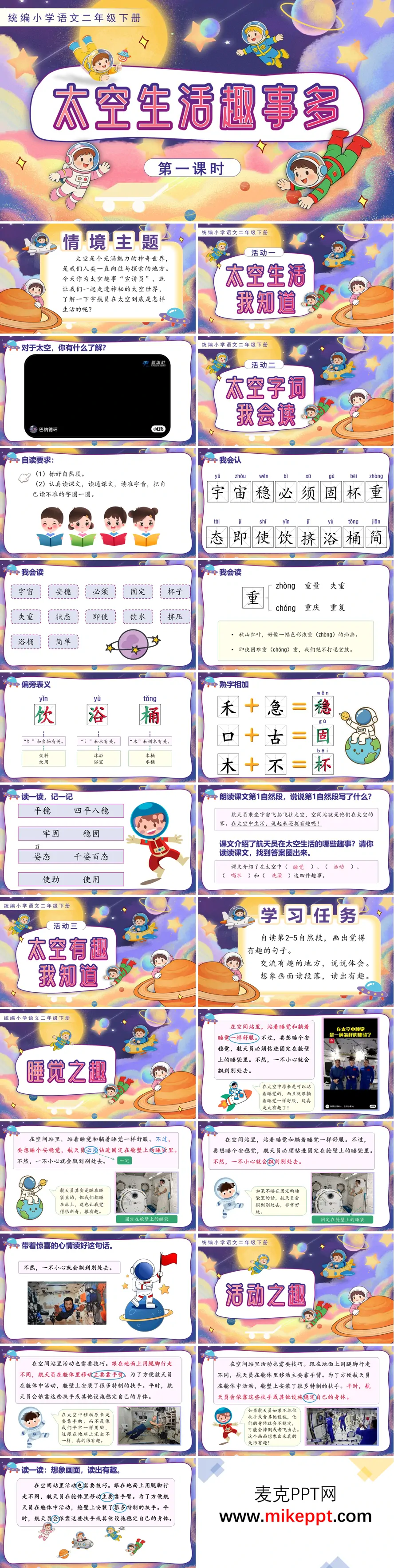 《太空生活趣事多》是统编小学语文二年级下册的双课时情境教学课件,以沉浸式太空探险为主线,带领学生开启奇妙的航天生活发现之旅。 第一课时从"招募太空趣事宣讲员"的情境任务切入,点燃学习热情。字词教学紧扣航天主题,运用"偏旁解密"策略引导学生发现"宇、宙"的宝盖头与房屋的关联,"稳"的禾木旁暗含平稳之意;通过"熟字相加"巧记"必"字,并重点突破"重"字的多音字辨析。课文研读聚焦航天员在轨生活的四大挑战——站着睡觉的别扭、靠扶手活动的笨拙、用吸管喝水的费劲、密封浴桶洗澡的复杂,配合失重环境下物品漂浮的影像资料,让学生在对比中感受地球引力的珍贵,在朗读想象中品味科普童话的幽默表达。 第二课时转向语言实践与书写指导。通过"要想……必须……"等句式仿说,内化课文逻辑;示范"航、宇、宙"等字的间架结构,强调左窄右宽的布局规律。 culminating in "太空生活我讲解"角色扮演活动,学生运用所学词汇与句式,向"地球观众"介绍太空趣闻,在真实交际中实现语言迁移,播撒探索宇宙的科学梦想。