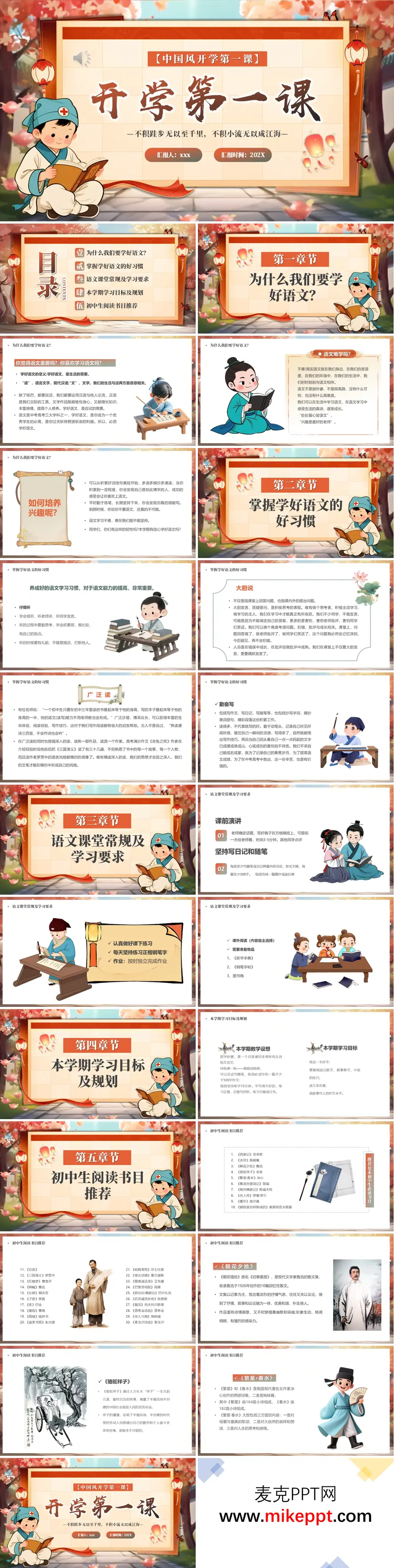 这套PPT的内容,是一位老师为初中语文学习所做的课堂引导或学习规划。它采用PPT演示文稿的结构,旨在阐明语文学习的重要性、方法、课堂要求与学期目标。 文档首先论述了“为什么我们要学好语文”,核心观点是语文既是生活与交际的必要工具,也是应对升学考试的关键学科。它鼓励学生克服畏难情绪,强调语文源于生活,兴趣可以通过日常积累(如摘抄佳句、勤于练笔)来培养。 其次,文档重点介绍了“学好语文的好习惯”,归纳为四个要点:仔细倾听、大胆发言、广泛阅读和勤奋写作。它详细阐述了这些习惯的具体做法和益处,例如鼓励学生在课堂上不怕犯错、积极发言,以及通过深度精读和坚持练笔来提升读写能力。 再次,文档明确了“语文课堂常规及学习要求”,包括课前演讲、每周撰写随笔或日记、课外阅读,并列出需要准备的《新华字典》、字帖等学习物品。 然后,文档列出了“本学期学习目标及规划”,具体包括完成国学背诵、坚持基础练习、每周写作、每日练字等教学设想,以及练好字、掌握阅读技巧、阅读名著、提高作文水平等学期目标。 最后,文档以“初中生阅读书目推荐”收尾,提供了30本中外经典名著的书单,并对其中《朝花夕拾》、《骆驼祥子》和《繁星·春水》三部作品进行了简要的内容与主题介绍。 整份文档以“不积跬步无以至千里,不积小流无以成江海”为开篇和结语,贯穿了重视积累、持之以恒的学习理念,结构清晰,旨在系统地激发初中生对语文学习的兴趣并指导其具体实践。