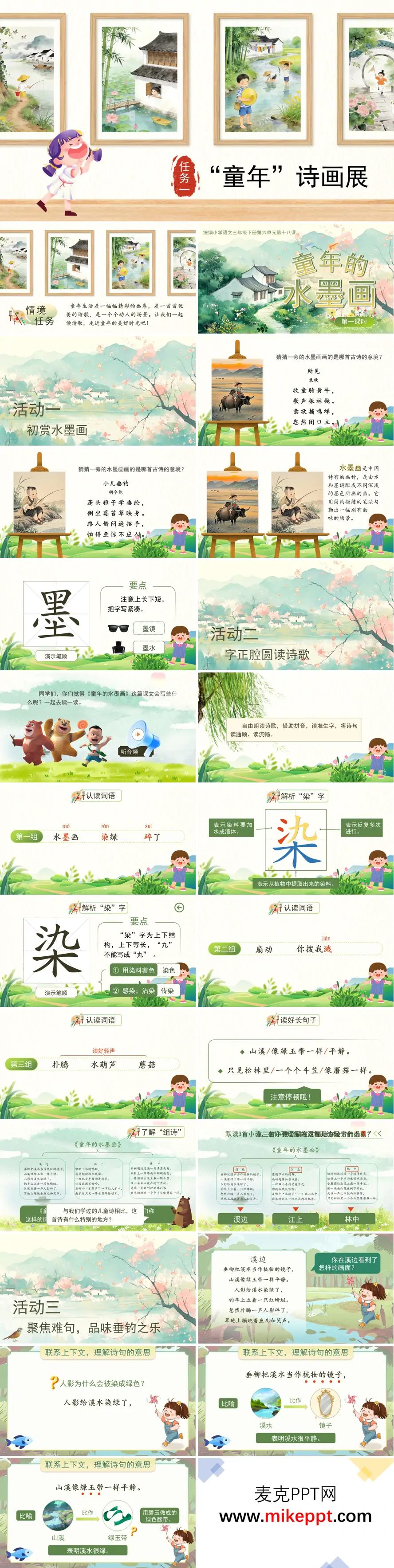 这是一套专为统编小学语文三年级下册《童年的水墨画》第一课时精心打造的教学课件,整体以清新雅致的水彩风格与灵动活泼的童趣插画为视觉基调,巧妙围绕"童年诗画展"这一富有创意的情境任务展开教学设计,引导学生在如诗如画的课堂氛围中走进文本、品读语言、感悟诗情。 课件开篇匠心独运,选取《所见》"牧童骑黄牛"、《小儿垂钓》"蓬头稚子学垂纶"等经典古诗的水墨画配画,引导学生初步欣赏水墨画"寥寥数笔、意境悠远"的独特艺术魅力,在传统文化的浸润中自然导入新课,建立"诗中有画、画中有诗"的阅读期待。 随后进入"字正腔圆读诗歌"基础环节,系统落实识字与朗读目标。针对"墨""染"等易错生字,通过动态笔顺演示、字理溯源解析(如"墨"字黑与土的组合,"染"字九次入水的染色过程),帮助学生建立形义联系;对"扑腾""水葫芦""斗笠"等富有生活气息的词语,结合图片观察与动作模仿,理解词义、读准字音。同时借助停顿符号与节奏划分,指导学生读好"垂柳把溪水当作梳妆的镜子""山溪像绿玉带一样平静"等长句,在反复诵读中初步感知《溪边》《江上》《林中》三首组诗明快的节奏与和谐的韵律。 核心教学环节聚焦《溪边》的精细品读,着力渗透"联系上下文理解难句"的阅读策略。教师引导学生重点关注"人影给溪水染绿了"这一精妙表达——联系上文"山溪像绿玉带一样平静",理解溪水碧绿澄澈,故而倒映其中的人影也仿佛被染上了绿色;品读"草地上蹦跳着鱼儿和笑声",结合生活经验想象鱼儿上钩时孩童欢呼雀跃的场景,体会"笑声"与"鱼儿"一同蹦跳的欢快乐趣。通过比喻修辞的赏析(如"垂柳把溪水当作梳妆的镜子"),引导学生发现垂柳、溪水、人影、钓竿构成的恬静画面,感受童年垂钓的专注与喜悦。 最后通过"溪""垂""钓"等重点生字的书写指导,从间架结构、关键笔画、书写姿势等方面进行细致示范,培养规范书写习惯。课堂小结梳理本课所学,回顾"读正确—想画面—品语言—悟情感"的诗歌学习方法,明确下节课将继续用此方法学习《江上》《林中》,为后续教学做好铺垫。 整套课件实现了"读诗—品诗—悟情"的教学闭环,从古诗导入激发兴趣,到字词朗读夯实基础,再到重点研读渗透方法,最后书写总结延伸下文,环节紧凑、层次清晰,充分体现了儿童诗教学"在诵读中想象、在想象中品味、在品味中感悟"的理念追求。