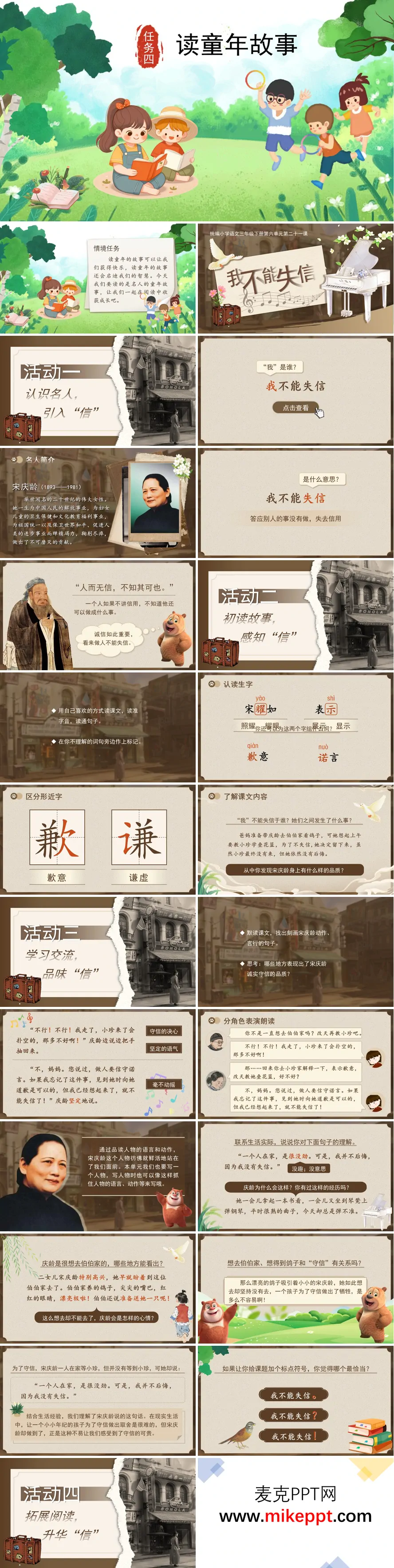 这是一套专为统编小学语文三年级下册《我不能失信》精心设计的教学课件,巧妙围绕"读童年故事"这一学习任务展开,以宋庆龄女士信守承诺的童年故事为核心文本,引导学生在品读探究中逐步感悟"信"的深刻内涵,实现语言学习与品德修养的有机融合。 课件开篇通过名人简介与经典名言自然引入主题。先以图文结合的方式简要介绍宋庆龄作为二十世纪伟大女性的卓越成就与高尚品格,建立学生对主人公的敬仰之情;继而呈现《论语》中"人而无信,不知其可也"的经典名句,在传统文化浸润中点明"诚信"这一核心主题,为整堂课奠定庄重而温馨的情感基调。 随后进入初读感知环节,系统落实识字与内容梳理目标。通过认读"耀""歉""诺""叠""篮"等本课生字,结合字理分析(如"诺"字从言若声的形声构造,"歉"字与"谦"的形近辨析),帮助学生扫清阅读障碍;引导学生借助时间线索(早晨—吃过午饭—下午),梳理出故事的核心情节:宋庆龄满心期待去伯伯家看鸽子,却因与小珍有约在先,最终选择留在家中教叠花篮,放弃盼望已久的出行,初步感知人物行为背后的品质光芒。 核心教学环节聚焦文本的精细品读。教师引导学生勾画描写宋庆龄言行的关键语句,如"不行!不行!我走了,小珍来了会扑空的,那多不好啊""我答应了,就一定要等她",通过反复的朗读指导,读出感叹号传递的坚决语气,体会她坚守信用的坚定决心;再通过分角色表演朗读,让学生分别扮演宋庆龄与父母,在对话交锋中感受"想去却不能去"的内心矛盾——对鸽子的喜爱、对伯伯家的向往,与对承诺的坚守、对小珍的负责形成张力,从而深刻理解守信需要克服诱惑、付出代价,更显其可贵品质。 最后以拓展阅读与生活联结收尾。补充宋庆龄一生恪守诚信的其他事迹,或推荐《曾子杀猪》等同类故事,拓宽阅读视野;设置"诚信小卫士"讨论环节,让学生联系生活实际,思考"答应同学的事没做到怎么办""捡到东西要不要归还"等现实情境,探讨如何在日常小事中践行诚信。整套课件实现了"读故事—悟品质—践行动"的完整教学闭环,让学生在语言实践中内化诚信美德,成长为言而有信的人。