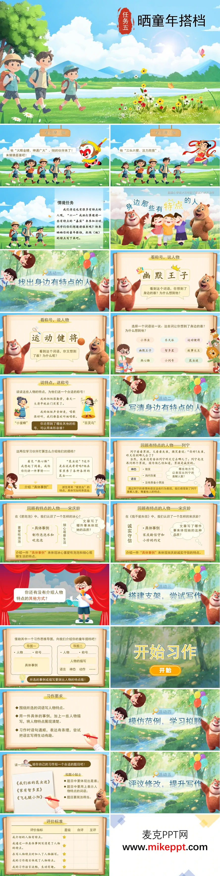 这是一套专为统编小学语文三年级下册"身边那些有特点的人"习作教学精心设计的课件,以"晒童年搭档"作为贯穿全课的情境任务,整体采用活泼灵动的童趣卡通风格,巧妙搭建起从方法习得到实践提升的完整习作教学闭环,有效降低写作难度,激发学生表达欲望。 课件开篇以趣味盎然的猜人物游戏巧妙导入,呈现"运动健将""幽默王子""故事大王""热心肠"等特色称号,引导学生根据称号联想身边同学、老师、家人的典型表现,在轻松愉快的氛围中完成习作选材铺垫,唤醒生活观察与记忆储备,让写作素材自然浮现。 核心教学环节先引导学生回顾本单元课文人物的刻画方法,重温《灰雀》中列宁善解人意的话语、关切的神态,《我不能失信》中宋庆龄坚定的语气、守信的行为,明确"用具体事例展现特点+运用语言、神态、动作等人物描写方法"的核心写作技巧,实现从阅读经验到写作方法的迁移转化。 随后搭建清晰实用的习作支架,提供思维导图模板,帮助学生梳理写作思路:中心位置填写人物特点称号,分支延伸典型事例、细节描写、内心感受等要素,明确"围绕一个词语写透特点、用一件或几件具体事例展开形象"的习作要求,让抽象的构思过程可视化、结构化。 后续环节涵盖系统的写作指导流程:拟题指导环节提供"我们班的昆虫迷""家有虎妈"等范例,引导学生学会用生动题目吸引读者;初稿创作环节给予充足的动笔时间与巡视指导;评议修改环节设计"六一活动拟邀嘉宾名单"实践任务,让学生互相阅读习作,根据"特点是否鲜明、事例是否具体、描写是否生动"等量化评价标准进行星级评定,提出具体修改建议,在互评互改中提升鉴赏能力与表达水平。 最后以课后分享建议收尾,鼓励学生将写好的习作读给文中人物听,观察其反应并记录,或制作成班级"人物风采墙"进行展示,实现从方法习得、构思搭建到实践写作、修改提升、成果分享的完整教学流程,让学生在真实的写作实践中收获成就感,提升习作素养。