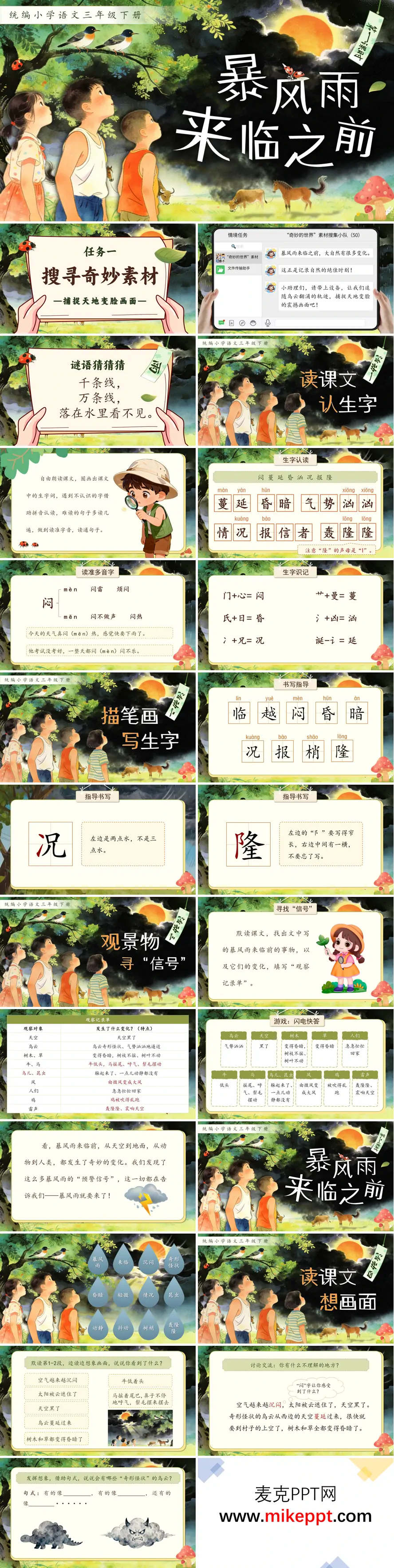 这套《暴风雨来临之前》教学课件专为统编小学语文三年级下册打造,以"奇妙的世界"为主线,营造出清新活泼的课堂氛围。课件从"搜寻奇妙素材"这一趣味情境出发,先用"谜语猜猜猜"点燃学生的学习热情,再带领孩子们走进课文、认识生字,对"闷、蔓、延、昏"等字词进行认读、识记与书写指导,并巧妙突破"闷"字的多音字难点。 核心板块"观景物,寻'信号'"引导学生静心默读,系统梳理暴风雨降临前天空、乌云、树木、牛马、鸟儿及人们的种种变化。借助"观察记录单"和"闪电快答"互动游戏,将抽象的"预警信号"化为直观可见的学习素材。随后的"读课文,想画面"与"深研读,感变化"环节,则聚焦"蔓延""闷"等关键词的品味,对比起风前后的景象差异,让学生在字里行间感受自然的神奇伟力。最后的"赏风雨,感自然"交流环节与拓展作业,巧妙搭建课堂与生活的桥梁,鼓励孩子们用发现的眼睛观察世界,逐步养成留心自然、热爱观察的好习惯。