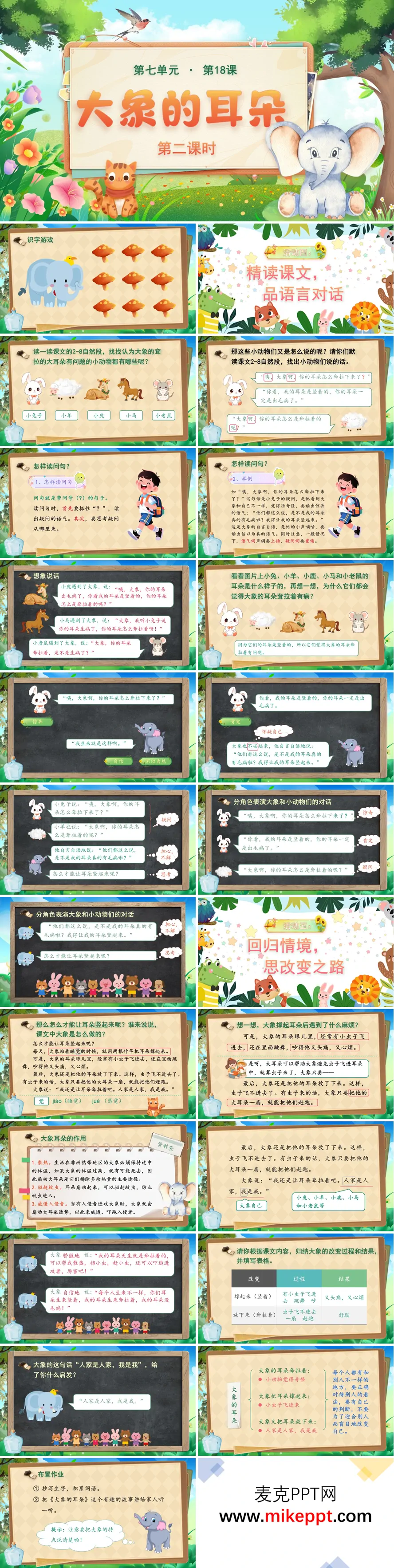 这是一套专为小学语文二年级下册《大象的耳朵》第二课时精心设计的教学课件,整体视觉呈现充满童真童趣,以憨态可掬的卡通大象、活泼灵动的小动物以及清新自然的风景画面作为背景元素,完美贴合低年级学生的认知特点与审美偏好,营造出轻松愉悦、引人入胜的学习氛围。 课件内容紧密围绕"大象的耳朵"这一核心线索展开,构建起层次清晰、互动性强的教学结构。开篇以趣味盎然的识字游戏巧妙导入,通过生字认读、词语搭配等游戏化形式巩固第一课时所学;随即设计"找角色"互动环节,引导学生快速定位小兔子、小羊、小鹿、小马、小老鼠等小动物,聚焦它们对大象耷拉耳朵的质疑与议论,为深入品读对话做好铺垫。 接着进入精读课文的核心环节,教师重点带领学生开展多元语言实践活动。通过"怎样读问句"的朗读指导,让学生体会"咦,大象啊,你的耳朵怎么耷拉下来了?""大象啊,你的耳朵怎么是耷拉着的呢?"等问句中蕴含的好奇、疑惑甚至略带嘲笑的语气,读出标点符号传递的情感色彩;"想象说话"环节鼓励学生设身处地,揣摩小动物们窃窃私语时的心理活动,以及大象听到议论后内心的波动变化;"分角色表演"活动则让学生分别扮演大象与各类小动物,在声情并茂的演绎中真切感受大象从最初"我生来就是这样啊"的坦然自信,到"他们都这么说,是不是我的耳朵真的有毛病啦"的深深怀疑,再到"怎么才能让耳朵竖起来呢"的不安焦虑的完整情绪变化轨迹。 随后,课件引导学生深入思考大象把耳朵撑起来后的种种麻烦:小虫子飞进耳朵眼儿里,在里面跳舞,吵得大象又头痛又心烦。通过这一情节的细致品读,帮助学生逆向理解大象耳朵耷拉着的实际作用——能够有效散热降温、驱赶蚊虫侵扰、威慑敌人进攻,是适应自然环境的智慧选择。最后,大象在经历折腾后重新把耳朵放下来,说出"人家是人家,我是我"这句富含哲理的话语,水到渠成地点明"接纳自我、不盲目跟风"的核心主题,让学生在故事感悟中建立积极的自我认知。 结尾布置分层实践作业:基础层认真抄写生字词语,巩固书写规范;提高层将《大象的耳朵》的故事生动讲述给家人听,并交流自己的感受与收获,实现课堂学习向家庭生活的有效延伸,帮助学生在知识巩固与情感表达中深化理解、内化道理。