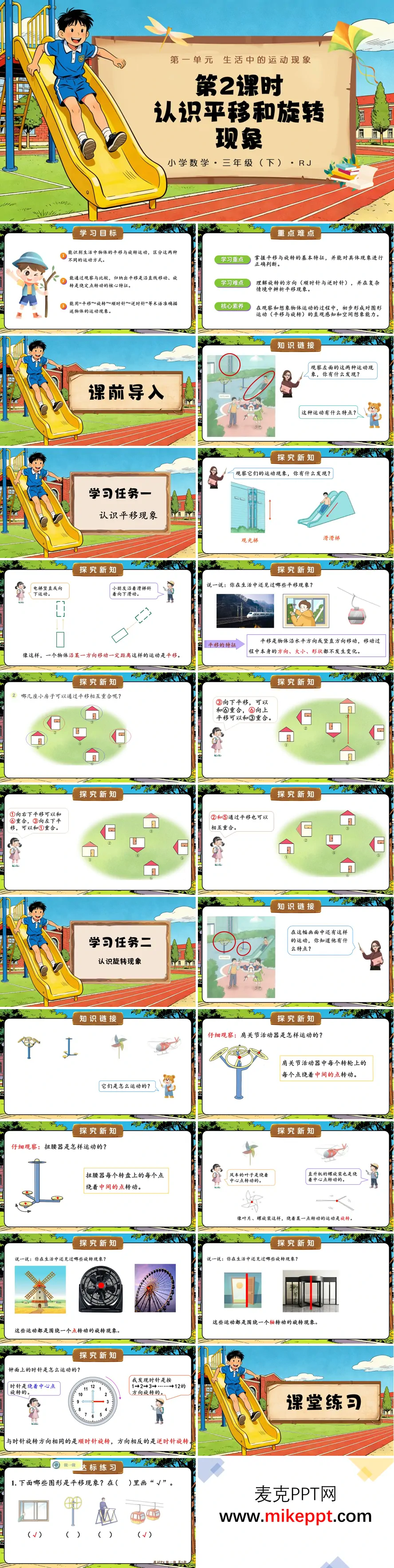 这是一套专为人教小学数学三年级下册《认识平移和旋转现象》第二课时精心设计的教学课件,整体以充满生活气息的校园操场作为童趣背景,滑梯、秋千、风车等游乐设施点缀其间,完美贴合低年级学生的认知特点与兴趣偏好,营造出亲切自然、寓教于乐的学习氛围。 课件开篇清晰明确地呈现学习目标与重难点,让学生知晓本节课要掌握平移和旋转的特征、能判断生活中的运动现象,并通过课前导入环节巧妙衔接旧知,回顾已学的对称现象,为学习新的图形运动方式做好认知铺垫。 主体教学分两大学习任务有序推进。任务一聚焦"探究平移",教师结合学生熟悉的观光电梯的上下移动、滑梯的直线滑行、推拉窗户的左右移动等生活实例,引导学生观察归纳:平移是物体沿着直线方向移动,移动过程中物体的形状、大小和方向都不发生改变,只有位置发生变化。为深化理解,设计"小房子平移重合"的动手练习,让学生在方格纸上将小房子图形按指定方向(向上、向下、向左、向右)平移指定格数,通过描点、数格、验证重合的过程,切实掌握平移的两个关键要素——方向与距离,发展空间观念与操作能力。 任务二转向"认识旋转",借助校园操场上的肩关节活动器、扭腰器、旋转秋千等真实器械,以及生活中的风车、钟表指针、瓶盖拧动等实例,阐释旋转是物体绕着一个定点或一条轴做圆周运动的现象。为丰富学生的方向认知,特别补充顺时针与逆时针的判断方法,结合钟表指针的转动方向建立直观表象,让学生能够准确描述旋转的方向特征。 后续设置多层次达标练习,层层递进深化知识理解。基础练习包括判断生活中各种现象属于平移还是旋转,如"汽车方向盘的转动""抽屉的推拉"等;应用练习设计图形平移涂色任务,让学生在方格纸上按要求平移图形并涂色,形成指定图案;拓展练习开展"拼组火箭"的实操活动,通过平移、旋转不同形状的卡片,组合成完整的火箭图形,在趣味操作中综合运用所学知识。 结尾通过简洁清晰的知识总结,梳理平移"沿直线运动、形状大小方向不变"与旋转"绕定点或轴转动、方向改变"的核心区别,布置绘制思维导图的课后任务,引导学生自主构建知识网络;同时设置分层作业,基础层记录生活中的5个平移或旋转现象,提高层设计一个利用平移或旋转原理的创意图案,实现课堂知识的巩固延伸与素养提升。