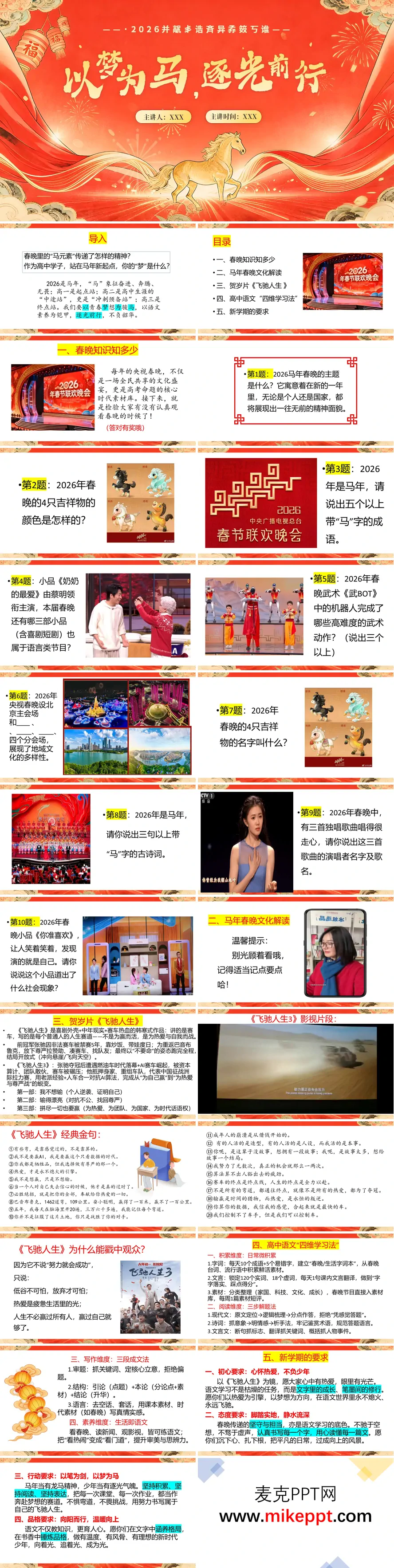 这套《以梦为马 逐光前行》高中语文开学第一课课件立足2026年马年背景,以国潮红金风为视觉基调,巧妙融合春晚热点与学科内核,呈现出大气磅礴的课堂气象。课程以春晚知识问答破冰,围绕年度主题、吉祥物寓意、经典节目等设置互动竞猜,顺势串联马年成语的豪迈意蕴与古典诗词的隽永情怀,在欢声笑语中完成传统文化的自然浸润。 随后借势贺岁大片《飞驰人生3》,深度剖析"热爱与坚持"的精神内核,将赛车手逐梦赛道的执着与语文学习的初心守望巧妙勾连,点燃学生的内在驱动力。核心板块"四维学习法"系统拆解高中语文的进阶路径:从基础积累的日拱一卒,到深度阅读的思辨萃取;从写作表达的匠心打磨,到审题立意的精准破题,并以春晚鲜活素材现场示范迁移运用,让方法落地有声。最后以"以笔为剑,以梦为马"的铿锵寄语明志,布置融合春晚观察与生活体悟的抒情散文作业,实现从热点互动到学科能力培养、从文化感知到表达实践的无缝衔接,助力学子在新学期逐光而行、执笔为戈。