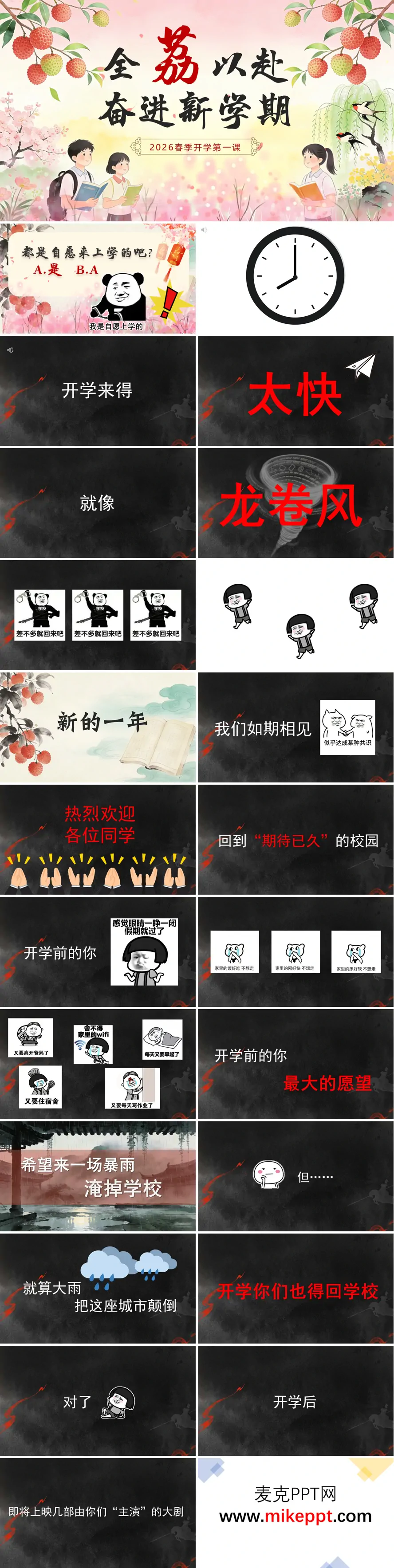 这套PDF(PPT)内容围绕“2026春季开学第一课”的主题,旨在以轻松幽默而又富有启发性的方式,帮助学生调整状态、积极迎接新学期。 内容主要分为三个部分。第一部分是“假期回忆录”,通过一系列生动有趣的图片和文字,刻画了学生在开学前常见的心理状态,如对假期结束的不舍、对开学的焦虑(“开学恐惧症”),并提供了如调整作息、制定计划等应对开学焦虑的实用建议。 第二部分“新学期,让自己全‘荔’以赴!”是核心,巧妙借用《长安的荔枝》中李善德克服万难运送荔枝的故事作为隐喻。PPT通过图文展示了李善德如何将“不可能的任务”通过实地考察、试验保鲜方法、设计运输路线(使用类似甘特图的“脚程格眼”)、整合资源等“项目管理”智慧予以完成。由此引申出对学生的启示:每个人的学习或人生目标就像一颗待运的“荔枝”,面对挑战要相信潜力、寻找方法、善用资源,并在追求成功时不忘初心。 第三部分“新学期目标”则回归具体的学习方法指导,以图文形式强调了课前预习、认真听讲、及时复习、建立错题本、遵守课堂纪律等良好学习习惯的重要性,鼓励学生在新学期全“荔”以赴,找到并完成自己的目标。 整体风格图文并茂,穿插网络流行语和表情包增加亲切感,旨在激发共鸣、缓解焦虑,并传递出积极行动、方法至上、坚持初心的核心激励信息。