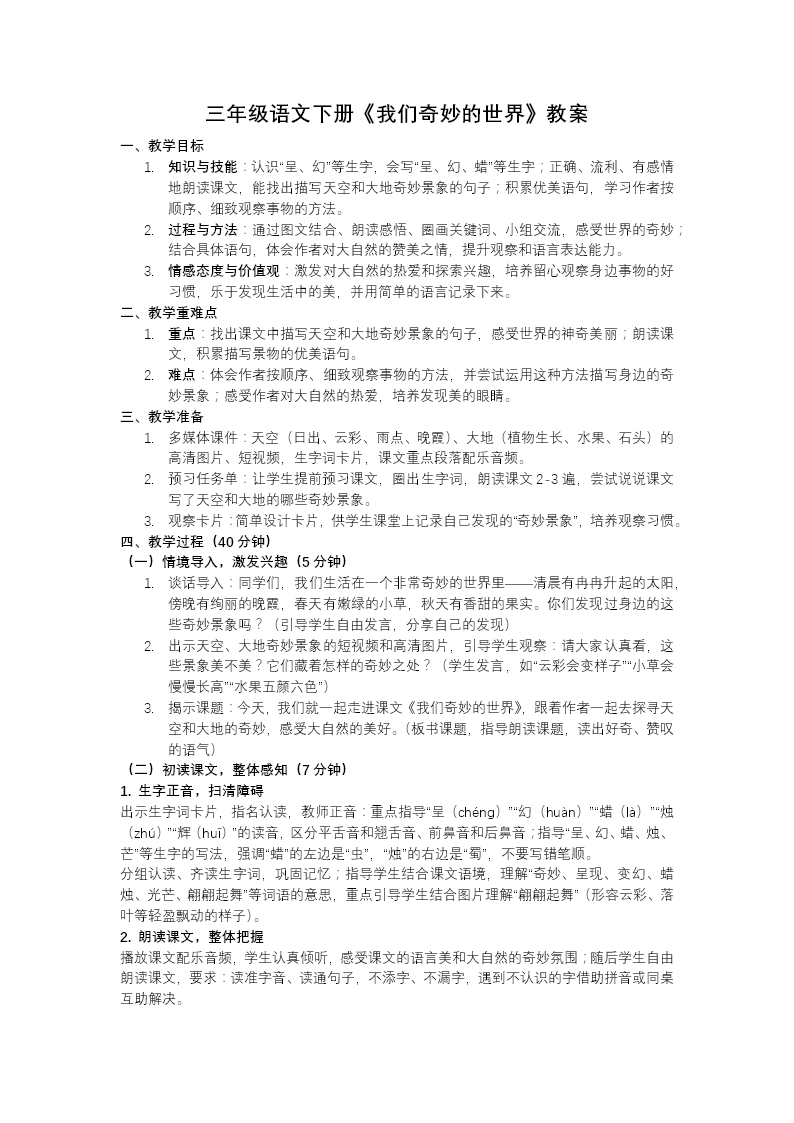 这套《我们奇妙的世界》教学课件专为统编小学语文三年级下册设计,整体以梦幻星空为底色,点缀童趣插画,营造出探索未知的浪漫氛围。课程以"搜寻奇妙素材"这一核心任务贯穿始终,先通过"围绕课题话奇妙""初感'奇妙'"等预热活动,带领学生认读生字新词,梳理课文"总—分—总"的谋篇结构,明确作者从"天空的珍藏"与"大地的珍藏"双线并进的描写视角。 第一课时"取镜天空,感受奇妙"聚焦课文2-8自然段,循着一天的时间脉络,引导学生品读旭日东升的蓬勃、云彩变幻的灵动、雨点降落的欢腾、落日余晖的绚烂、群星闪烁的神秘,在比喻、拟人等修辞的品味中,感受语言文字的画面张力。第二课时"取镜大地,感受奇妙"则切换至四季轮回的时空维度,探索春生草木的生机、夏熟果实的斑斓、秋藏动物的灵趣、冬凝冰雪的纯净。课程辅以生字书写指导与观察实践作业,将课堂发现延伸至生活,鼓励孩子们以童真的眼睛捕捉身边的美好,在寻常日子里发现不寻常的奇妙。