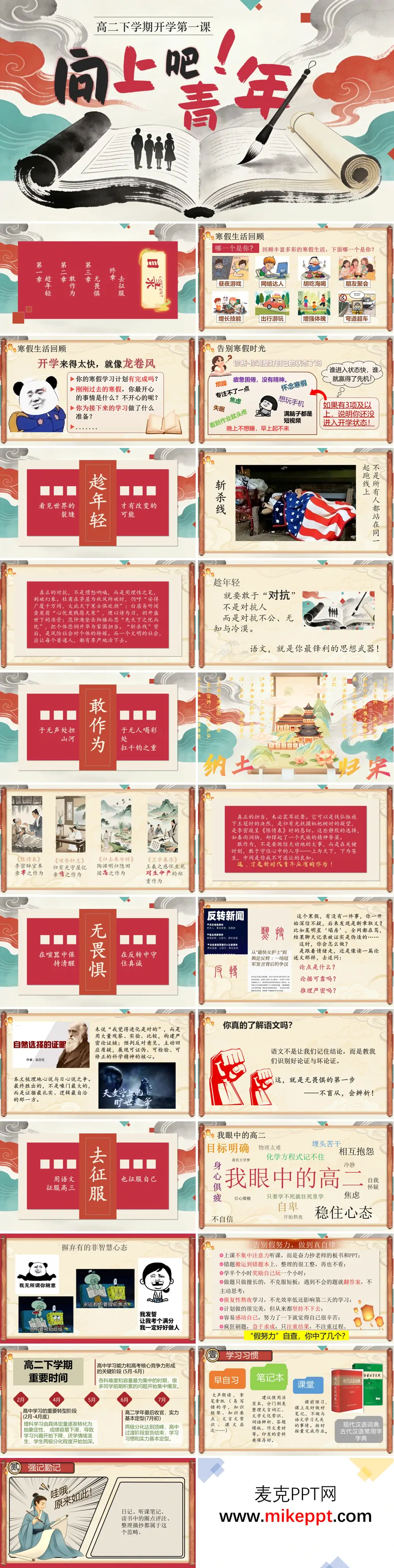 这份PDF文档的内容是一份面向高中二年级学生(高二下学期)的开学第一课主题课件或讲稿的图文资料。其核心目标是引导学生调整状态、确立目标、理解语文学科的深层价值,并为即将到来的高三做准备。 文档内容以四个章节为主体框架展开: 1. 第一章:趁年轻。引导学生回顾寒假生活并自检开学状态,进而提出“趁年轻,要敢于对抗”的主题。此处的“对抗”被定义为对抗社会不公、无知与冷漠,并引用了杜甫、白居易、范仲淹等古代文人的例子,强调语文是进行理性思考与表达的“最锋利的思想武器”。 2. 第二章:敢作为。通过《陈情表》、《项脊轩志》、《归去来兮辞》、《兰亭集序》等经典课文,阐释“作为”的内涵——它未必惊天动地,而是在关键时刻守住良知与担当,于无声处担起责任。 3. 第三章:无畏惧。结合“天价寻狗”、“鼠头鸭脖”、“女护士夺冠争议”等反转新闻案例,教导学生在信息纷杂的时代保持清醒,学会像分析论述文一样质疑论点、论据与推理,培养不盲从、会辨析的批判性思维。 4. 第四章:去征服。直面高二学生可能面临的“目标明确但身心俱疲”、“自我怀疑”等心态,提供了具体的行动指南。这包括识别并告别“假努力”现象、把握高二下学期各阶段(2-4月转型期、5-6月能力形成期、7月定型期)的学习重点,以及详尽的语文学科学习方法,如使用活页本分类整理、强记基础知识(字词、古诗文)、积累成语与作文素材(包括典故、工匠精神等主题),并掌握叙述技巧、文言实词等专项知识。 通篇以激励性语言贯穿,如“不要定义现在的自己”、“追赶日出是献给自己浪漫”等,最终落脚于鼓励学生以“向上”的姿态,用语文这门工具去“征服”学业挑战与自我成长。