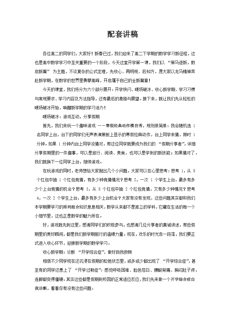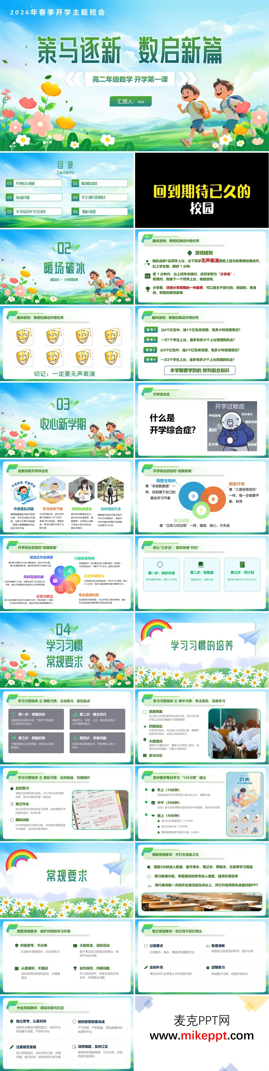 这份PPT课件以“策马逐新 数启新篇”为主题,是一份为高二年级学生设计的2026年春季数学开学第一课班会材料。其内容结构完整,旨在引导学生从假期状态顺利过渡到新学期的学习轨道。 课件从暖场破冰游戏入手,设计了“寒假经典动作模仿秀”等趣味互动,并巧妙融入排列组合的初步思考,自然引出本学期即将学习的数学知识。紧接着,它正视并引导学生“自我诊断开学综合症”,从作息、效率、情绪、目标四个方面分析常见问题,并提供了包含调整作息、制定计划、专注课堂在内的“自我救赎”方法与具体的“收心三步法”。 课件的主体部分聚焦于学习习惯、常规要求与学期规划。它详细阐述了课前预习、课中听讲、课后复习的“124”每日学习习惯建议,并明确了课前、课堂、笔记、作业等方面的具体常规要求。关于本学期学习内容,课件明确指出将使用人教A版(2019)选择性必修第三册教材,核心内容包括计数原理、随机变量及其分布、成对数据的统计分析三大模块,并以思维导图形式呈现。课件还将学期学习划分为“基础夯实”、“能力提升”、“冲刺备考”三个阶段,并提供了“理解为王”、“题型归纳”等四大学习策略,以及夯实基础、提升应用、冲刺备考的具体方法。 最后,课件以一系列激励性标语收尾,如“你现在的每一页笔记,都在书写未来的录取通知书”、“放弃有15笔坚持有16笔多一笔就是奇迹”等,鼓舞学生在新学期坚持努力,展望未来。整体而言,这份PPT兼具趣味性、实用性与激励性,是一份系统性的新学期动员与学法指导材料。