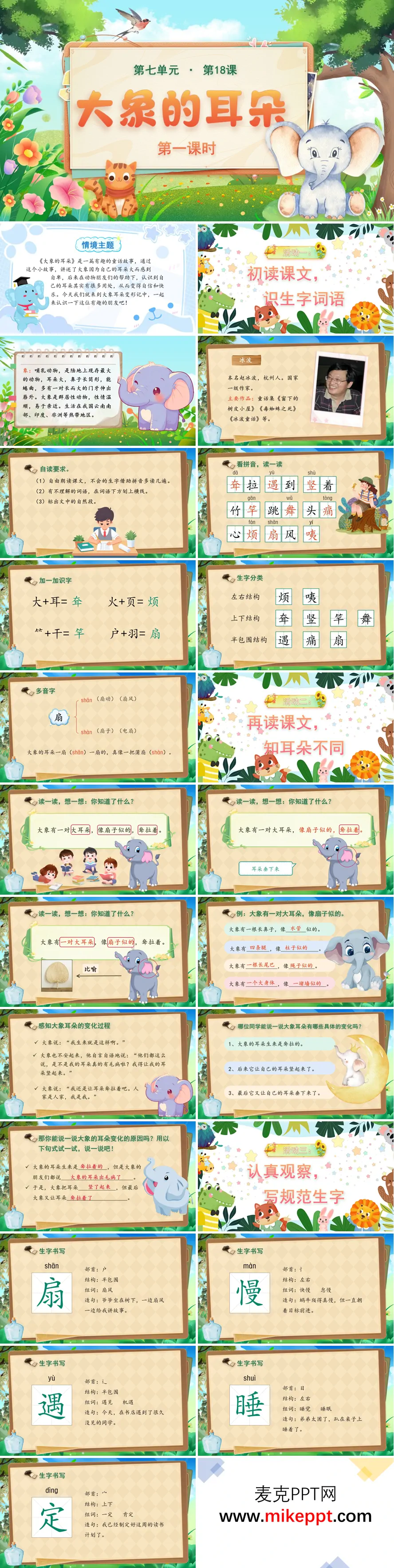 这是一套专为小学语文二年级下册《大象的耳朵》第一课时精心设计的教学课件,整体视觉呈现充满童真童趣,以憨态可掬的卡通大象、活泼灵动的小动物形象贯穿始终,搭配清新自然的森林背景,非常贴合低年级学生的认知特点与审美偏好,营造出轻松愉悦、引人入胜的学习氛围。 课件内容结构清晰严谨,教学环节层层递进,构建起完整的语言学习链条。开篇"情境导入"环节点明课文是一篇富有哲理的童话故事,讲述大象因为耳朵耷拉着与众不同,在他人质疑中经历自卑迷茫,最终认识到自身独特价值、学会接纳自我的成长历程。同时简要介绍作者冰波的创作背景与文学成就,激发学生的阅读期待与探究兴趣,为深入文本奠定情感基础。 "初读识字"环节系统落实生字教学目标,采用多元策略夯实语言基础。通过"看拼音读词语"准确认读"耷、遇、竖、扇、痛、烦"等生字;运用"加一加识字法",如"大+耳=耷""辶+禺=遇",帮助学生建立字形组合规律;进行"生字结构分类",将半包围结构、上下结构、左右结构的字归类整理,培养汉字结构意识;特别针对"扇"等多音字进行辨析,区分"扇子(shàn)"与"扇风(shān)"的不同读音与用法,让识字过程富有层次与趣味。 "再读感知"环节聚焦文本核心内容,引导学生深入品读。重点赏析大象"耷拉着的耳朵像扇子似的"这一经典比喻句,通过实物观察与图片对比,体会比喻修辞的形象生动,并鼓励学生模仿造句,进行初步的语言运用练习。同时梳理大象耳朵"耷拉—竖起—再耷拉"的变化过程,借助关键词句"我生来就是这样啊""他们都这么说,是不是我的耳朵真的有毛病啦""我还是让耳朵耷拉着吧",让学生初步感知大象从自信坦然到怀疑不安,最终回归自我的心理变化轨迹,为第二课时深入理解"人家是人家,我是我"的主题做好铺垫。 "规范书写"环节重点指导"扇、慢、遇、睡"等要求会写的生字,从部首归属(如"扇"的户字头、"睡"的目字旁)、间架结构、组词拓展到造句运用进行细致讲解,配合动态笔顺演示与书写姿势提醒,培养学生规范、端正、整洁的书写习惯。 整份课件以生动的画面和互动式的设计,将识字积累、阅读感知与初步理解融为一体,既扎实落实了语文基础目标,又巧妙渗透了"做自己、不盲从"的成长主题,为下一课深入探究大象耳朵的作用与故事哲理做好了充分铺垫,充分体现了低年级阅读教学工具性与人文性相统一的价值追求。
