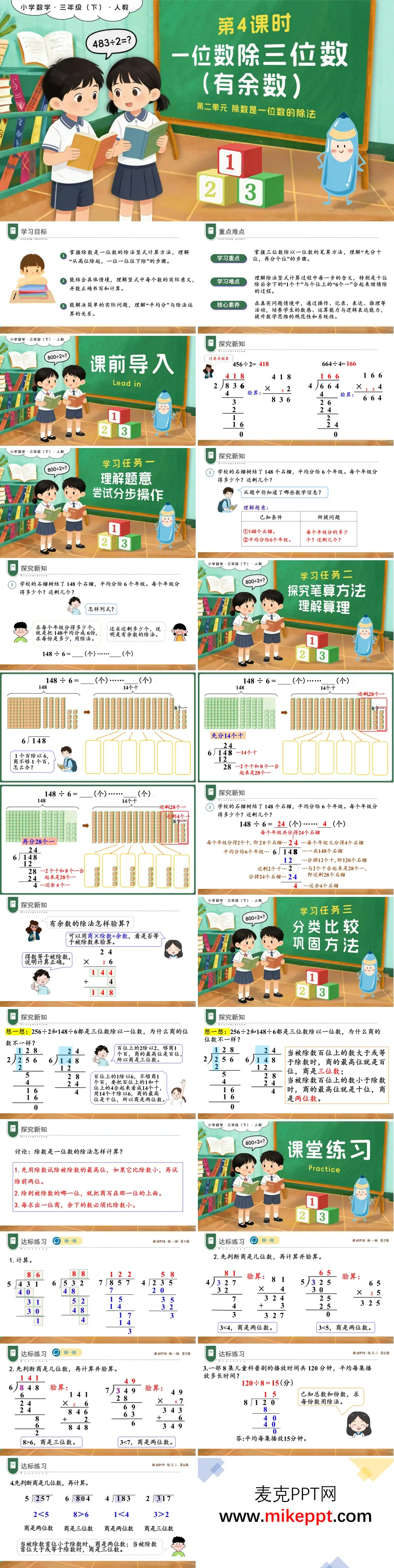 本课为人教版小学数学三年级下册《一位数除三位数(有余数)》教学设计,整体采用活泼生动的课堂场景插画风格,充分契合小学生的认知特点与学习需求。课程内容紧扣"除数是一位数的除法"单元主题,从课前导入环节的旧知回顾自然过渡,借助"学校石榴树结了148个石榴,平均分给6个年级"这一富有生活气息的实例,引导学生深入理解有余数除法的实际意义,重点探究"先分十位、再分个位"的竖式笔算步骤,并掌握"商×除数+余数=被除数"的验算方法,确保计算结果的准确性。教学过程中,课件通过对比256÷2与148÷6两道例题商的位数差异,帮助学生自主归纳重要规律:当被除数百位上的数字大于或等于除数时,商为三位数;当被除数百位上的数字小于除数时,商则为两位数,从而提升学生的观察与概括能力。此外,PPT精心设计了层次分明的达标练习,内容涵盖判断商的位数、竖式计算训练、实际问题解决及数学规律探究等多个维度,全面巩固所学知识。最后通过系统的知识总结与针对性课后作业,引导学生自主梳理知识脉络,有效提升运算能力与逻辑表达能力,为后续学习奠定坚实基础。
