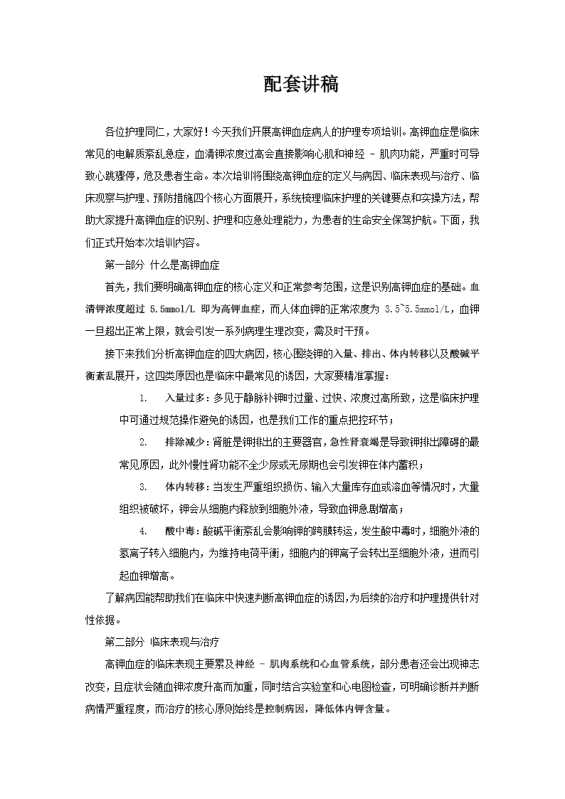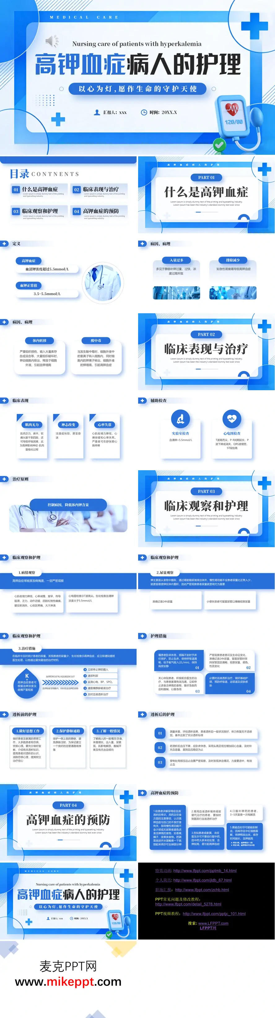 这套PPT《高钾血症病人的护理》是一份医学护理领域的专业汇报材料,主题明确,结构清晰,主要用于介绍高钾血症的相关知识和护理要点。其核心内容围绕四个部分展开: 首先,第一部分“什么是高钾血症”明确了疾病定义,指出高钾血症是指血清钾浓度超过5.5mmol/L(正常值为3.5-5.5mmol/L)。PPT图文并茂地阐述了其主要病因,包括钾摄入过多(如静脉补钾不当)、钾排出减少(如急性肾衰竭)、钾从细胞内转移至细胞外(如严重组织损伤、输入大量库存血)以及酸中毒。 其次,第二部分“临床表现与治疗”系统总结了患者的症状,如肌肉无力、麻木、软瘫、呼吸困难、神志改变(淡漠或昏迷)以及心律失常,严重时可导致心脏停搏。诊断方面依赖于血清钾检测和特征性心电图改变(如T波高尖)。治疗原则在于控制病因并降低体内钾含量。 接着,第三部分“临床观察和护理”是PPT的重点,详细列出了护理措施。这包括密切观察病情(特别是心电和生命体征)、准确记录24小时尿量、以及执行治疗措施(如立即停止钾摄入、利尿、遵医嘱输液,必要时进行血液透析)。PPT还特别分述了血液透析前(如心理疏导、保护血管通路)和透析后(如评估效果、监测血压、压迫止血)的具体护理要点。 最后,第四部分“高钾血症的预防”强调了健康教育和饮食管理的重要性,指导患者(尤其是慢性肾功能不全者)避免高钾食物(如香蕉、橘子),注意烹饪方式以减少钾摄入,按时透析,并谨慎服用可能含钾高的药物或中药。 整体而言,这套PPT内容专业、逻辑性强,从疾病定义、诊断治疗到临床护理和预防,形成了完整的知识闭环,旨在帮助医护人员全面掌握高钾血症病人的护理流程与关键注意事项。