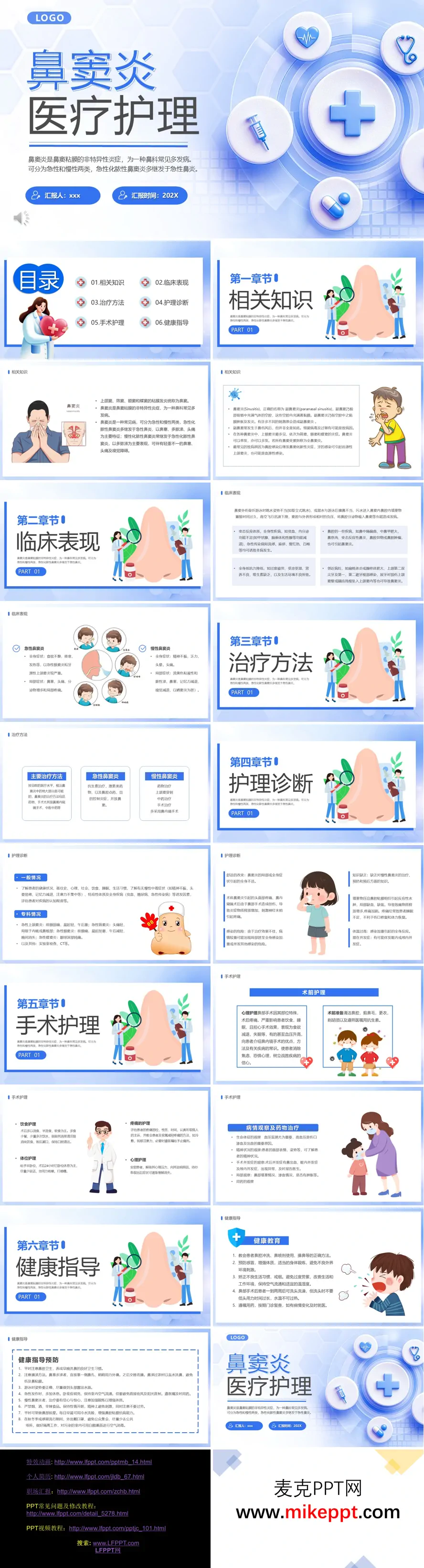 这套PDF呈现了一份关于鼻窦炎医疗护理的演示文稿(PPT)内容,其主题明确,结构清晰,主要围绕鼻窦炎的医学知识与临床护理展开。 该PPT以“鼻窦炎医疗护理”为主题,开篇即明确定义鼻窦炎为鼻窦粘膜的非特异性炎症,是常见的鼻科多发病,并分为急性和慢性两类。整体内容被系统地分为六个主要章节。第一章“相关知识”阐述了鼻窦炎的病因、定义(包括“副鼻窦炎”这一正确名称的提及),以及各鼻窦受累的情况。第二章“临床表现”详细区分了急性与慢性鼻窦炎各自的全身及局部症状,并列举了多种可能致病的诱发因素。第三章“治疗方法”概述了包括药物、手术(特别是鼻内镜手术)及中医中药在内的主要治疗手段。第四章“护理诊断”从护理角度出发,评估患者状况,并列出如舒适度改变、疼痛、感染风险、知识缺乏等核心护理诊断。第五章“手术护理”是重点部分,细致说明了围绕鼻内镜手术的术前准备、术后饮食与体位管理、疼痛护理、心理支持以及病情观察要点。第六章“健康指导”则提供了全面的康复与预防建议,如正确的鼻腔清洁方法、生活习惯调整、增强体质以及术后注意事项等。 文稿内容在多个章节重复了核心定义以强化主题,并配合了章节分隔图示(如“PART 01”标识),使逻辑层次分明。其目的是为医疗护理人员或相关学习者提供一套关于鼻窦炎从病理认知到临床治疗,再到细致护理与健康教育的完整知识体系。