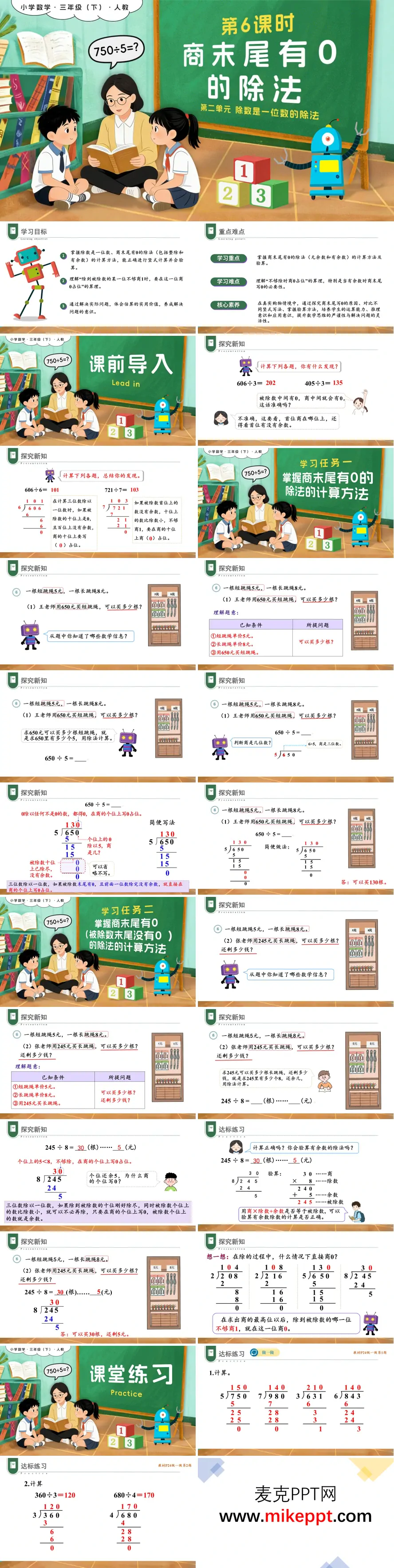 本课为人教版小学数学三年级下册《商末尾有0的除法》教学设计,整体采用活泼生动的课堂场景插画风格,充分契合小学生的认知特点与学习兴趣。课程内容围绕"除数是一位数的除法"这一核心主题展开,从课前导入环节的旧知回顾入手,先通过口算练习帮助学生巩固商中间有0的除法计算方法,再自然过渡到商末尾有0的除法新知探究。 课件以"购买跳绳"这一贴近学生生活的实例为线索,分两个层次循序渐进地展开教学:第一层次聚焦被除数末尾有0的情况,以650÷5为典型例题,详细讲解当除到被除数末尾且前一位刚好除尽时,可直接在商的个位写0占位的简便书写方法;第二层次针对被除数末尾没有0的情况,以245÷8为例,重点指导学生理解当除到被除数个位不够商1时,需在商的个位写0,同时将个位上的数直接作为余数的处理规则,并通过"商×除数+余数=被除数"的验算方法确保计算正确。 此外,PPT精心设计了丰富多样的达标练习,内容涵盖竖式计算规范、验算方法应用、实际问题解决、数学规律探究以及典型错题辨析等多个维度,帮助学生全面巩固所学知识。最后通过系统的知识总结与分层课后作业,引导学生自主梳理商末尾有0的除法计算要点,有效提升运算能力与逻辑表达能力,培养认真细致的计算习惯。